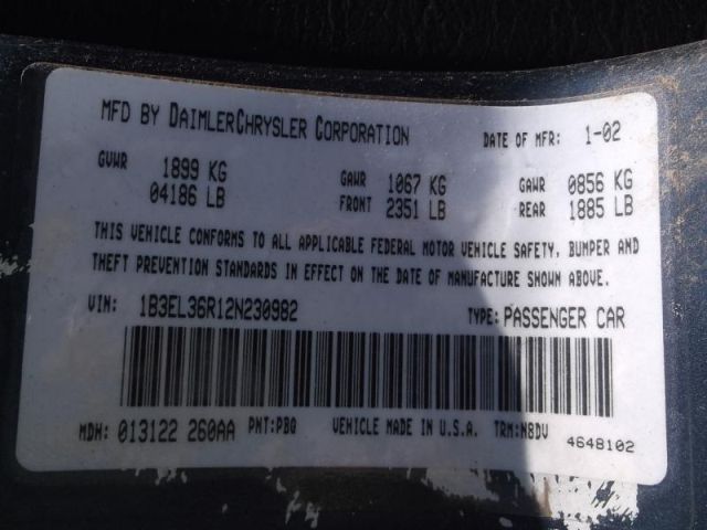 2002 Dodge Stratus 111,780 Miles VIN: 1B3EL36R12N230982, Sedan, FWD, V6, 2.7L Title # 13247134A009735 1 Key 125