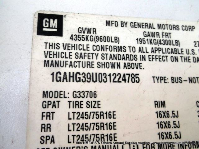2003 CHEVROLET 15 PASSENGER VAN ~ 133,611 MILES VIN: 1GAHG39U031224785, EXPRESS, FULL-SIZE, RWD, V8, 6.0L, WHITE, A/C COOL, 1/2 TANK GAS, **NEEDS JUMP** CSF TITILE #: 12055434A100043 1 KEY 51081 G84979