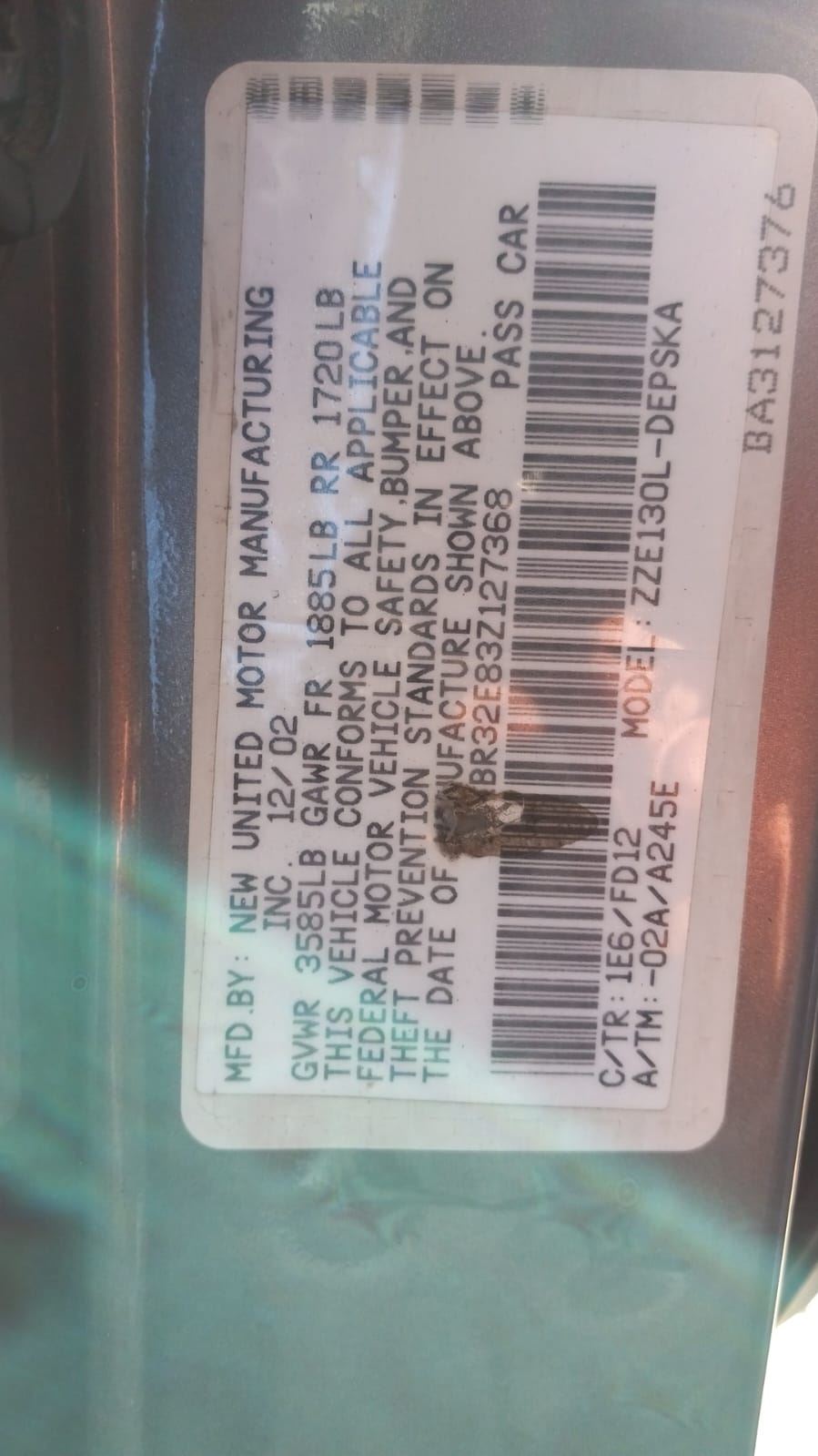 Title: ADT, Pno: NO, Vin: 1NXBR32E83Z127368, Mileage: 292414