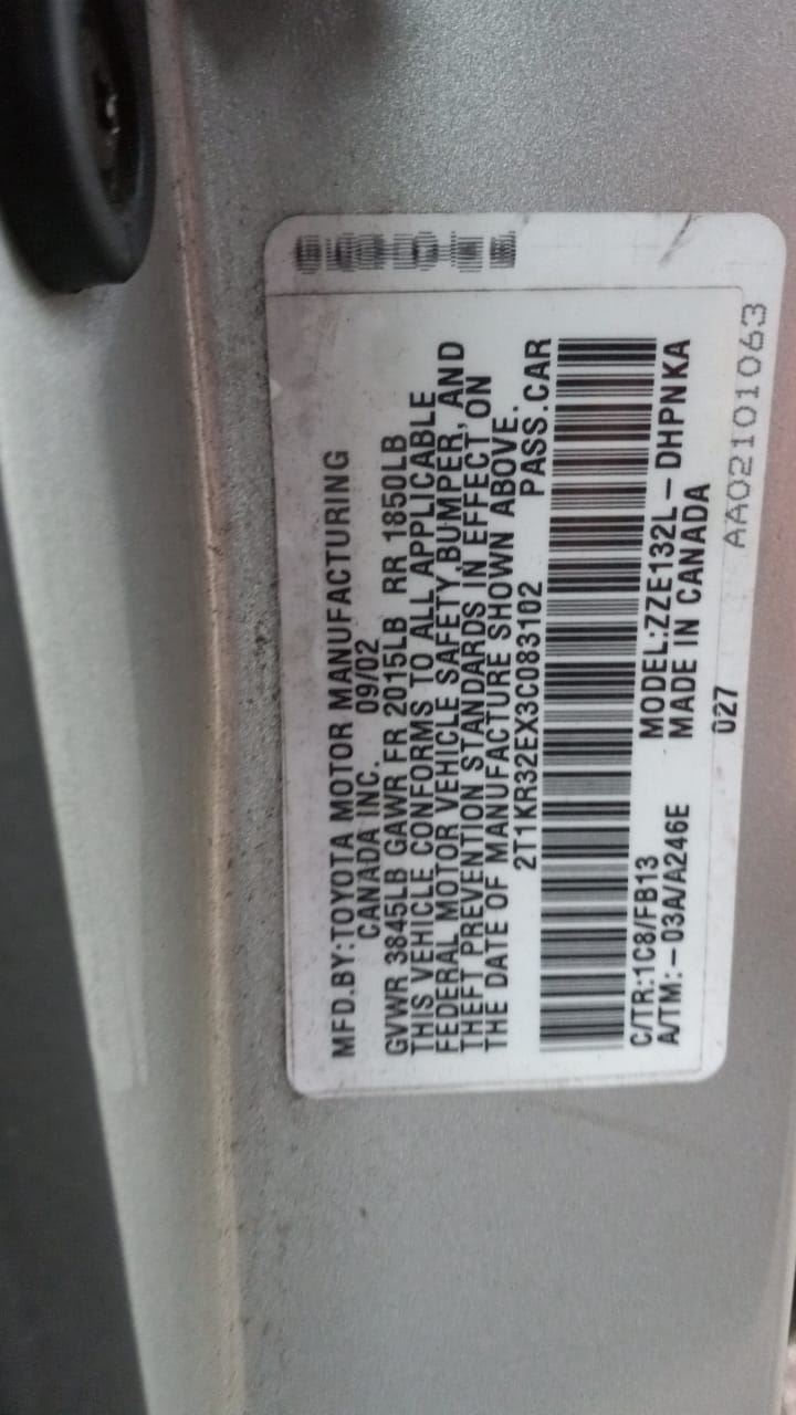 Title: T, Pno: YES, Vin: 2T1KR32EX3C083102, Mileage: 180058