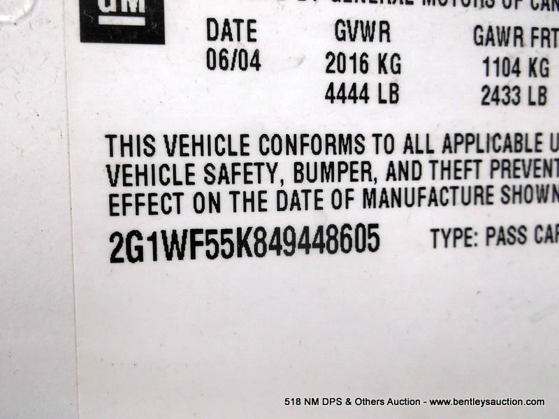 2004 CHEVROLET IMPALA ~ 110,130 MILES VIN: 2G1WF55K849448605, WHITE SEDAN, FWD, V6, 3.8L, AC ???, EMPTY FUEL, **NEEDS JUMP**, SFP TITLE # 15210934A325080 2 KEYS G59273