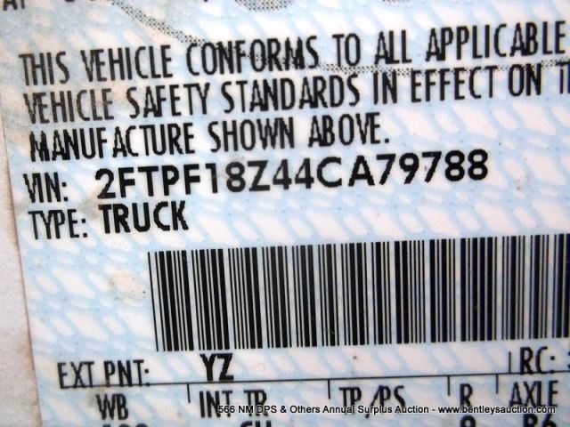 2004 FORD F-150 PICKUP 4X4 ~ 124,013 MILES VIN: 2FTPF18Z44CA79788, PICKUP, 4WD, V8, 5.4L, WHITE, HERITAGE, WINDSHIELD CRACKED, A/C COLD, 1/2 TANK GAS, EXTRA FUEL TANK-DUEL FUEL, BACK WINDOW GRILL-HEAD ACHE RACK, NMGF TITLE #: 161621GSD807516 3 KEYS G-584