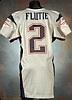 On the front left tail is the "Reebok" manufacturer's tag. Inside the back collar is another manufacturer's tag with "05-44" on it. On the bottom front collar is the embroidered official "NFL Equipment" logo patch. Below that is the embroidered official "PATRIOTS" name. The player number "2" appears on the front, back, and sleeves in navy blue on white on red triple tackle twill. Across the back is the player name "FLUTIE" on a grey name plate in navy blue tackle twill. Below the player number on each sleeve is the embroidered "Reebok" logo patch and "PATRIOTS" team patch. The jersey has blue spandex sides and custom open sleeves. The jersey shows light use and there appears to be no alterations of any kind.