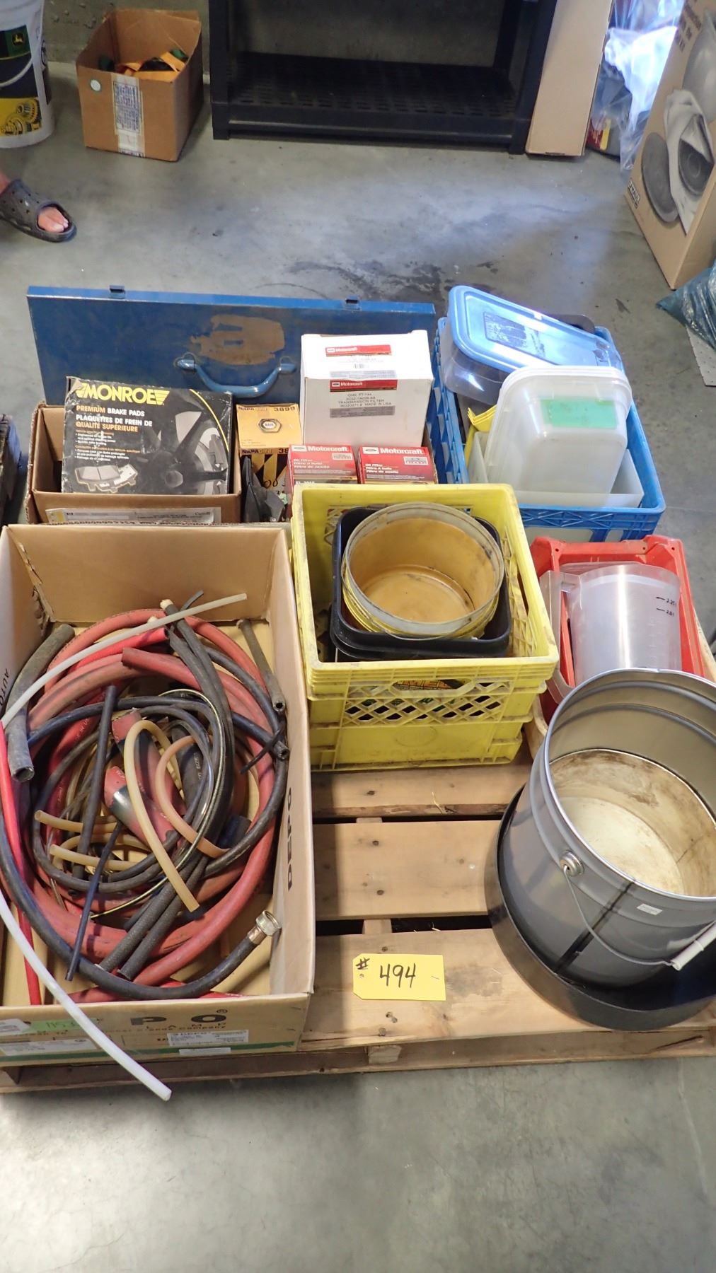 2005 F350 PARTS (FILTERS, BRAKE PADS), HEATER HOSES, PLASTIC CONTAINERS & METAL BOX