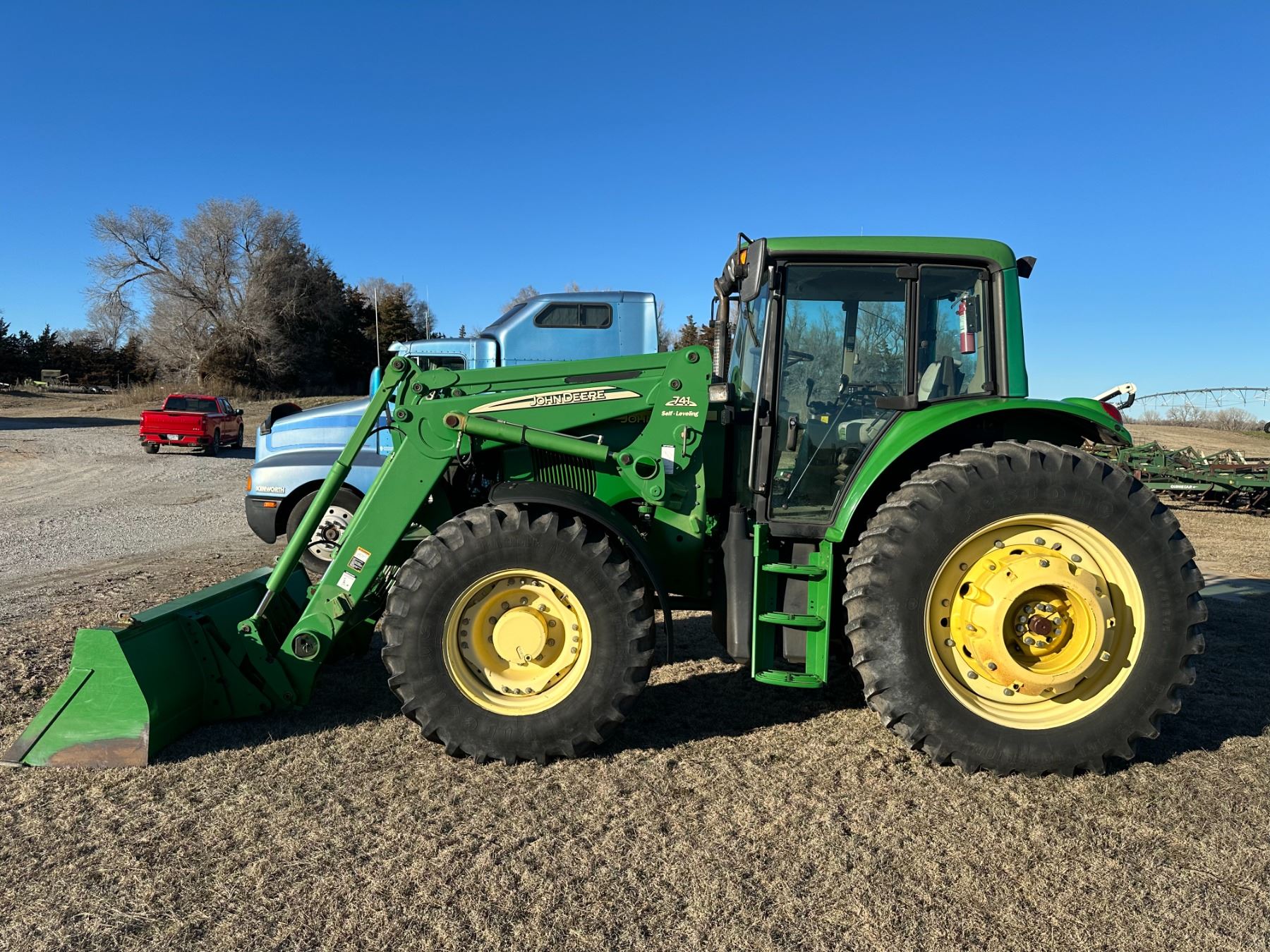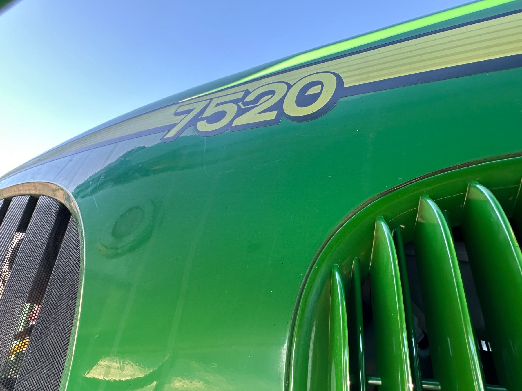2005 J.D. 7520 Tractor/ JD 741 Loader/self-leveling. 8’ bucket, 4,095 hrs, 3 PT, Quick Hitch, PTO, 42” rear, 28” front 16sp power quad, left hand reverse, 2 remotes, good rubber.