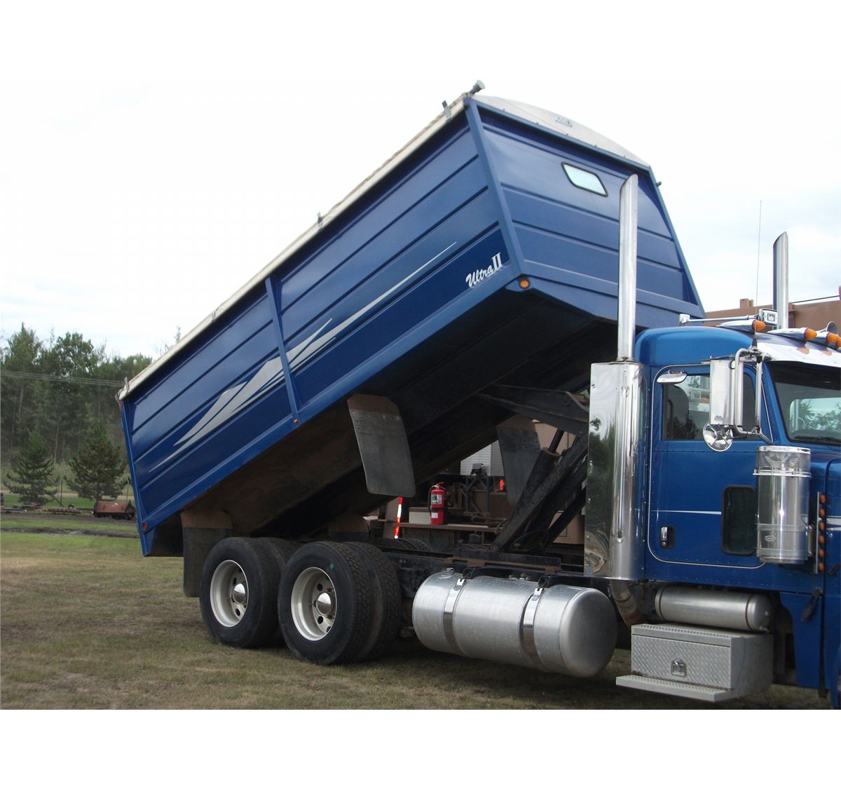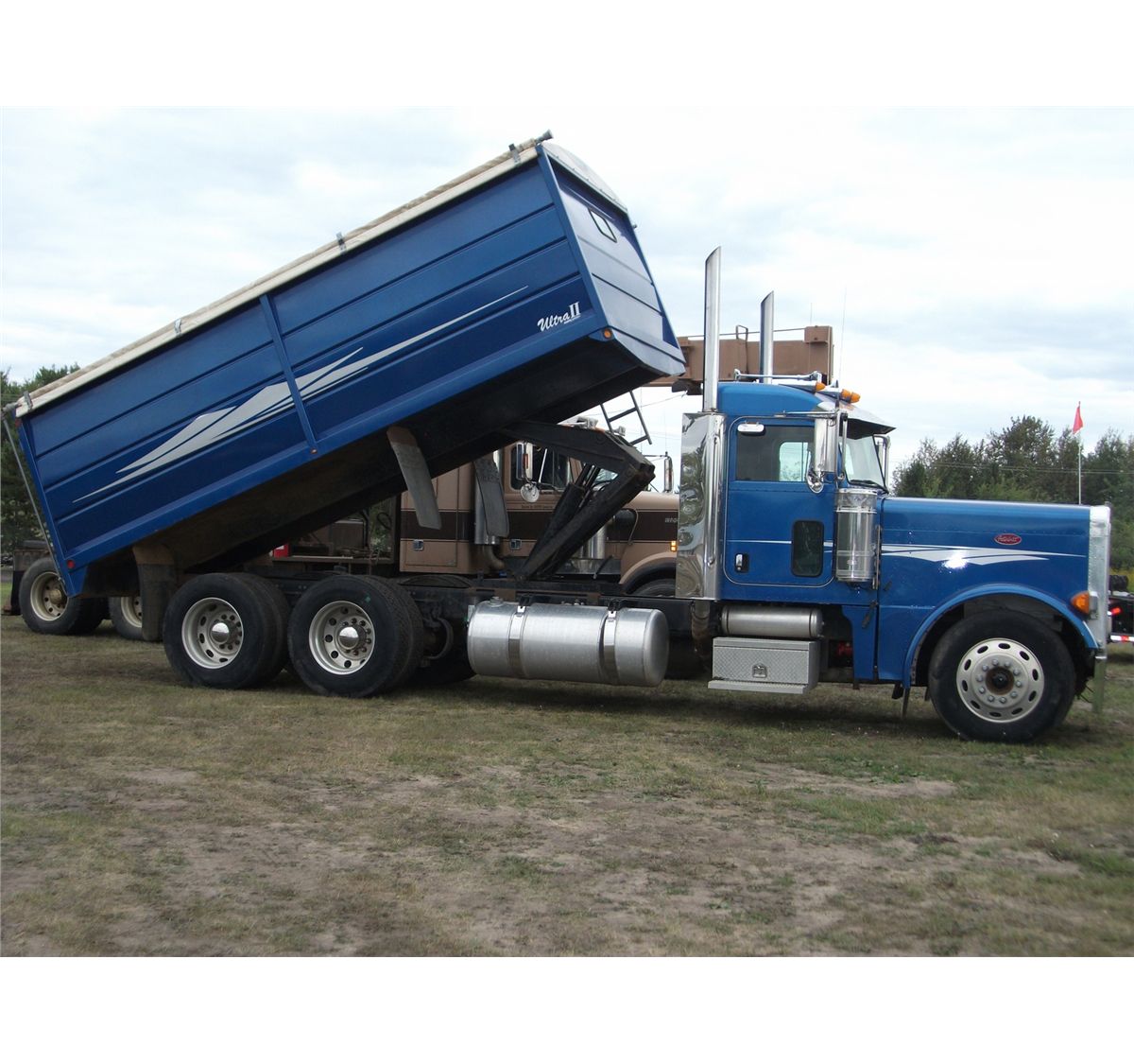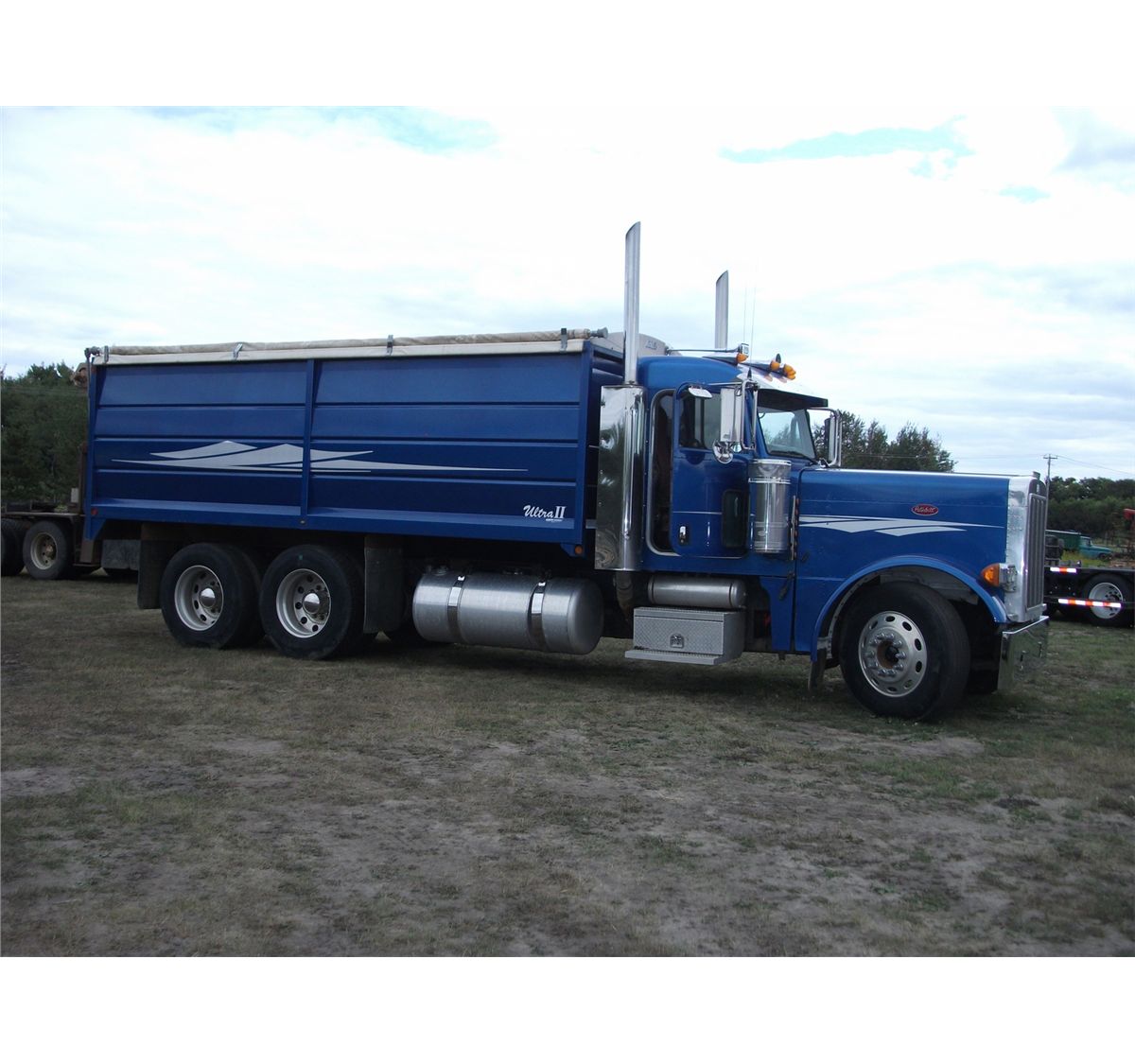 379 L engine; blue; showing 008447 km; automatic transmission; tandem axle; with Ultra II 19' box and hoist; front tires 11R - 24.5; rear tires 11R - 24.5; aluminum rims; Cat C13 engine; Michael's roll tarp; rear hoist control; air ride suspension; Out of Provice; SN #1XP-5DU9X-4-5D847720