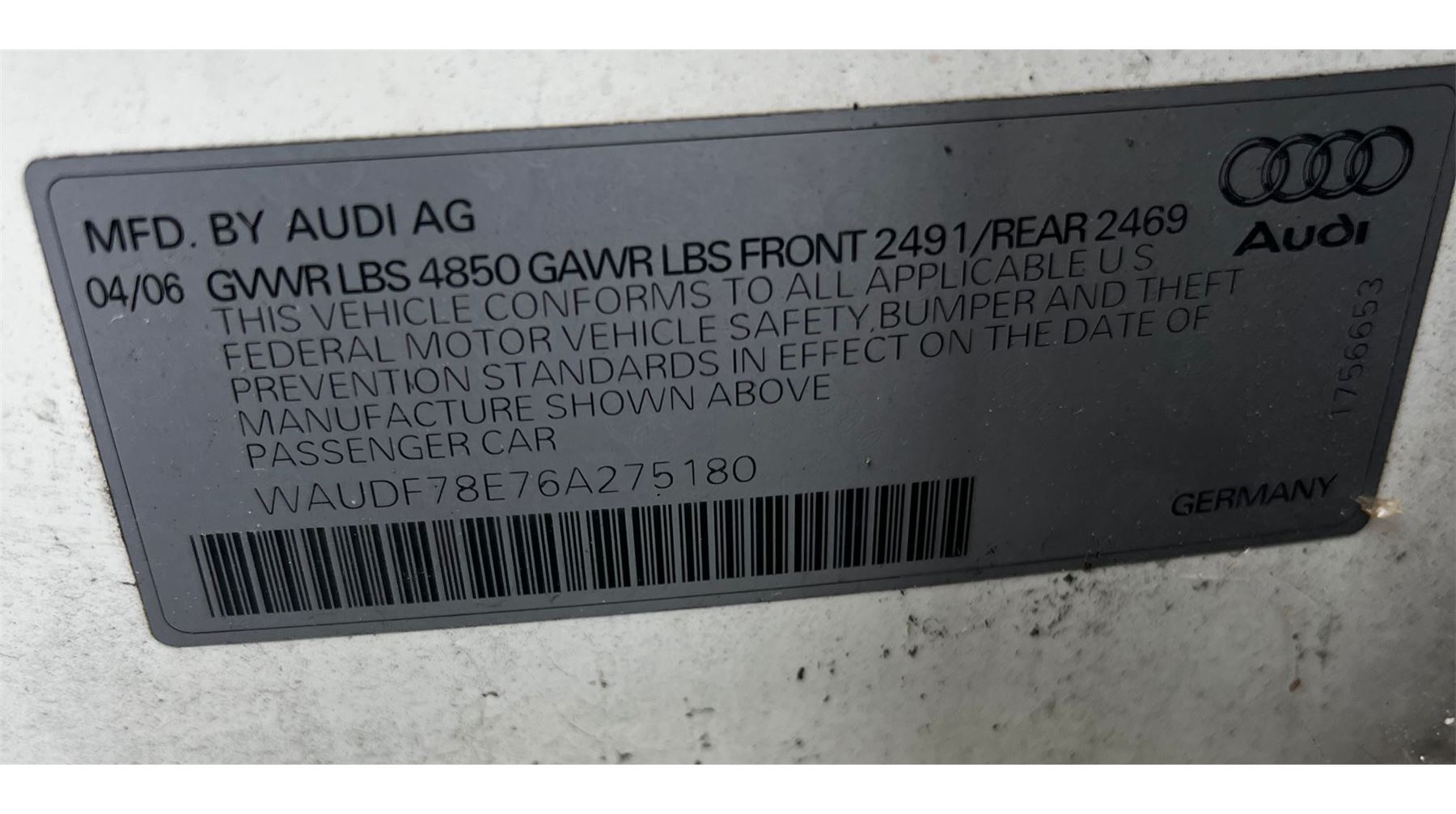 PAPER WORK : T EXPIRATION : 6.1.2020 VIN : WAUDF78E76A275180