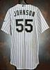 On the front left tail of this jersey is the "Majestic" manufacturers tag. Below this is an embroidered strip tag which reads "55 52 06 515". Inside the left hip of the jersey are three additional tags reading "+1" SLEEVE", "+2" BODY" and a wash code tag with "0062" on it. Across the front of the jersey is "MARLINS" done in black on silver on teal triple tackle twill. Below that and on the back is the player number "55" done in the same tackle twill. Across the back of the jersey is the player name "JOHNSON" done in black on silver on teal on white tackle twill. On the back of the collar is the official MLB logo patch. On the left sleeve is the Marlins logo patch. Below that is the embroidered "Majestic" logo. The jersey shows game-use and appears to have no alterations of any kind.