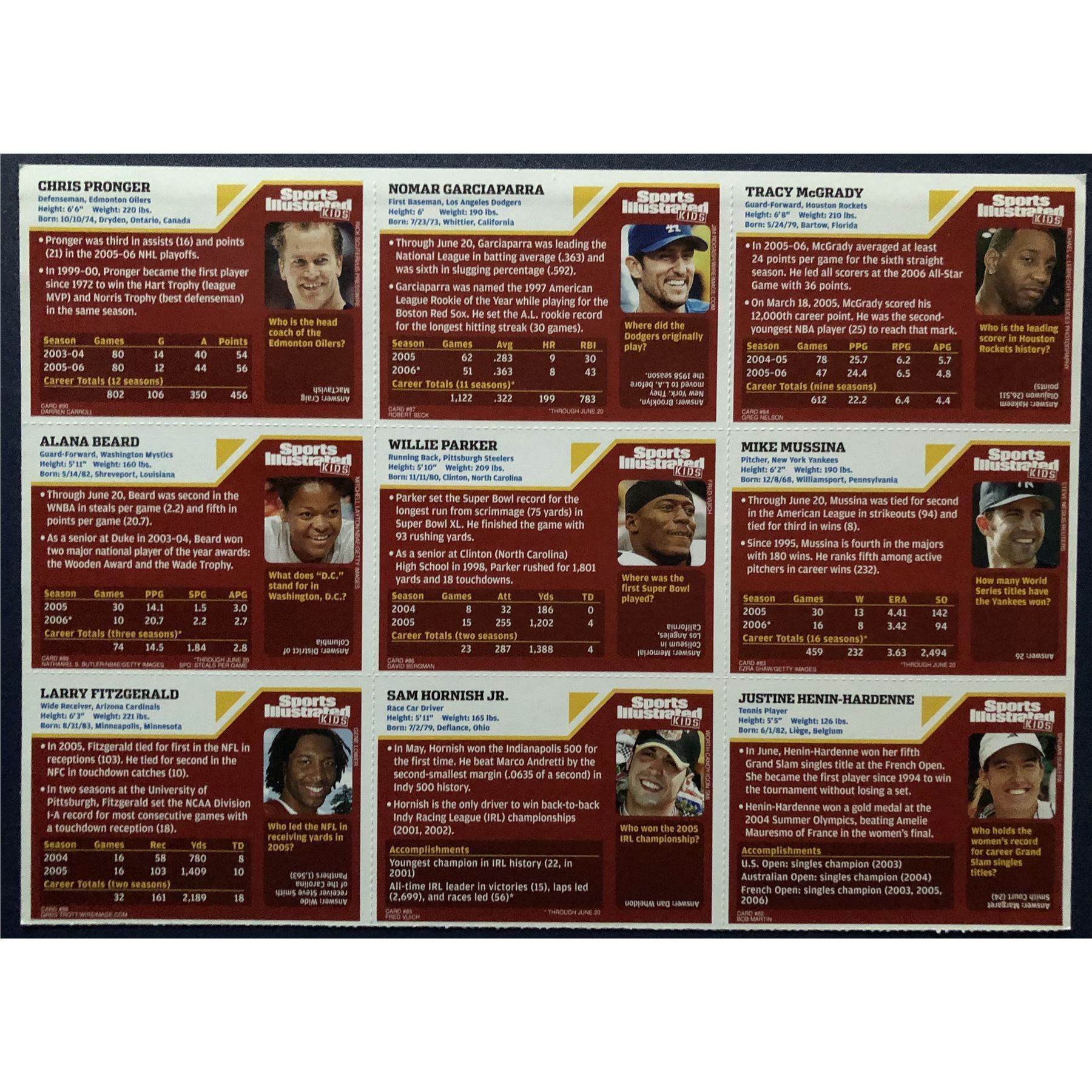 9 card sheet featuring HOF'ers Mike Mussina, Tracy McGrady & Chris Pronger.