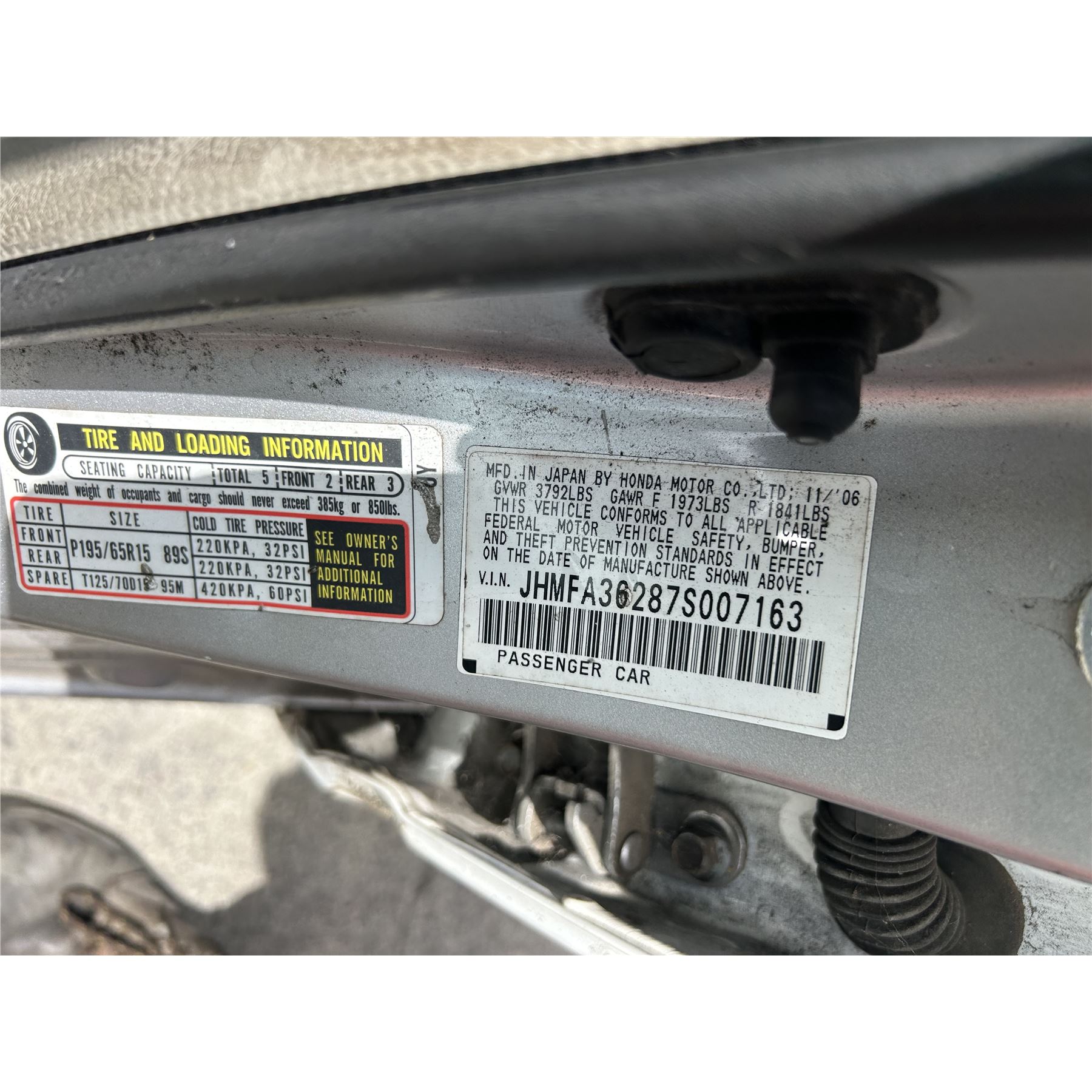 Title: T, Plate Expiration: 12-18-2024, Pno: NO, Vin: JHMFA36287S007163, Mileage: 126430