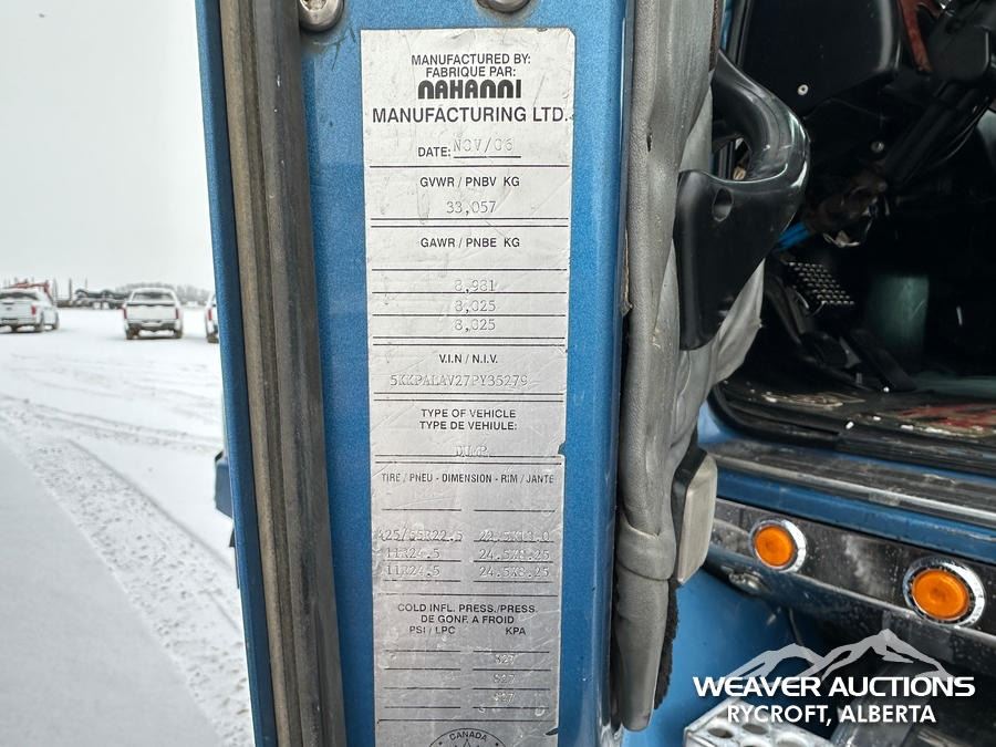 Specifications: ENGINE BRAKE, TRIPLE DIFFERENTIAL LOCKS, 19,800 LB FRONT AXLE, 53,079 LB REARS, MERITOR RZ-166 REARS, 4.30 AXLE RATIO, 72,879 LB GVWR, AIR RIDE CAB, ALUMINUM WHEELS, DOUBLE FRAME, AIR RIDE SUSPENSION, 260 IN WHEELBASE, PTO, NAHANNI 22 FT LONG BODY, ROLL TARP, REAR HYDRAULICS, PINTLE HITCH