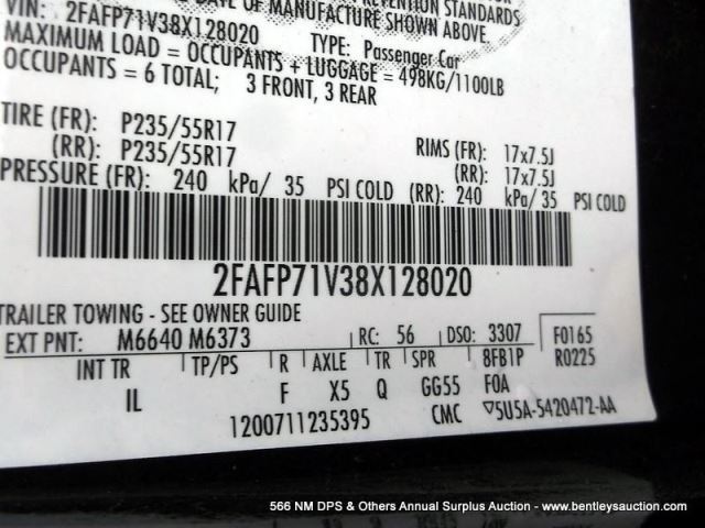 2008 FORD CROWN VICTORIA ~ 097,602 MILES VIN: 2FAFP71V38X128020, SEDAN, RWD, V8, 4.6L, BLACK & WHITE, AC COLD, FRONT BUMPER DAMAGE, PEELING PAINT, 1/2 TANK GAS, NMDPS TITLE #: 08050134A205598 3 KEYS 0246-08