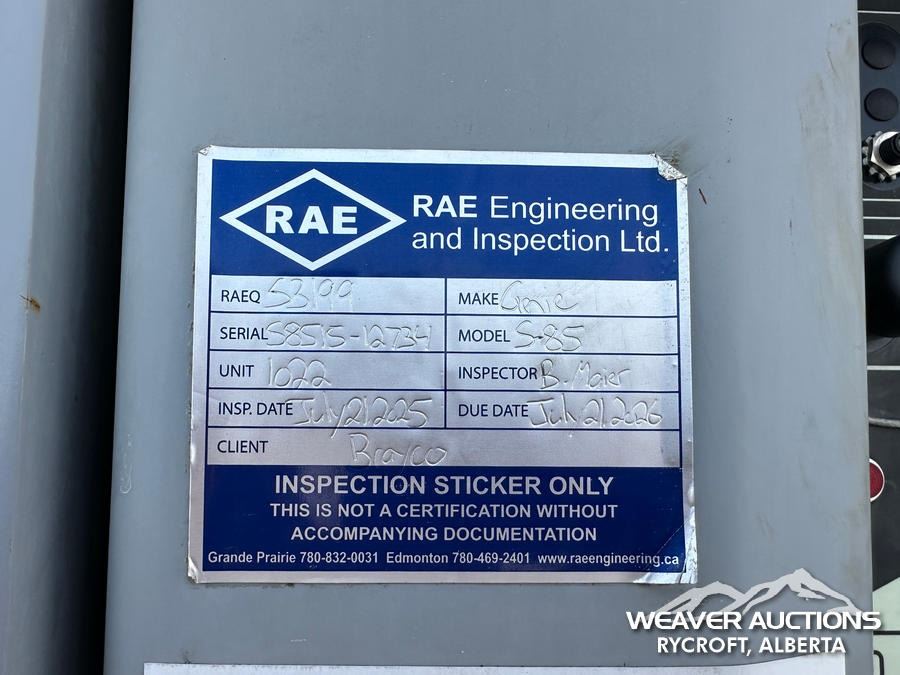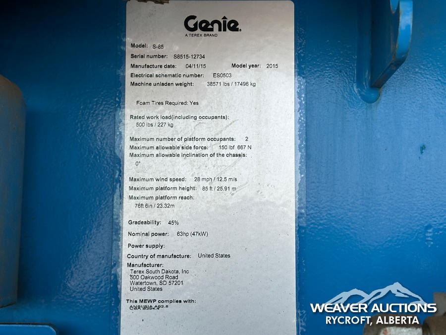Specifications: 85 FT MAX LIFT HEIGHT, 500 LB MAX WEIGHT CAPACITY, JIB, POWER TO PLATFORM, PERKINS 4 CYLINDER DIESEL ENGINE, 18-625NHS TIRES