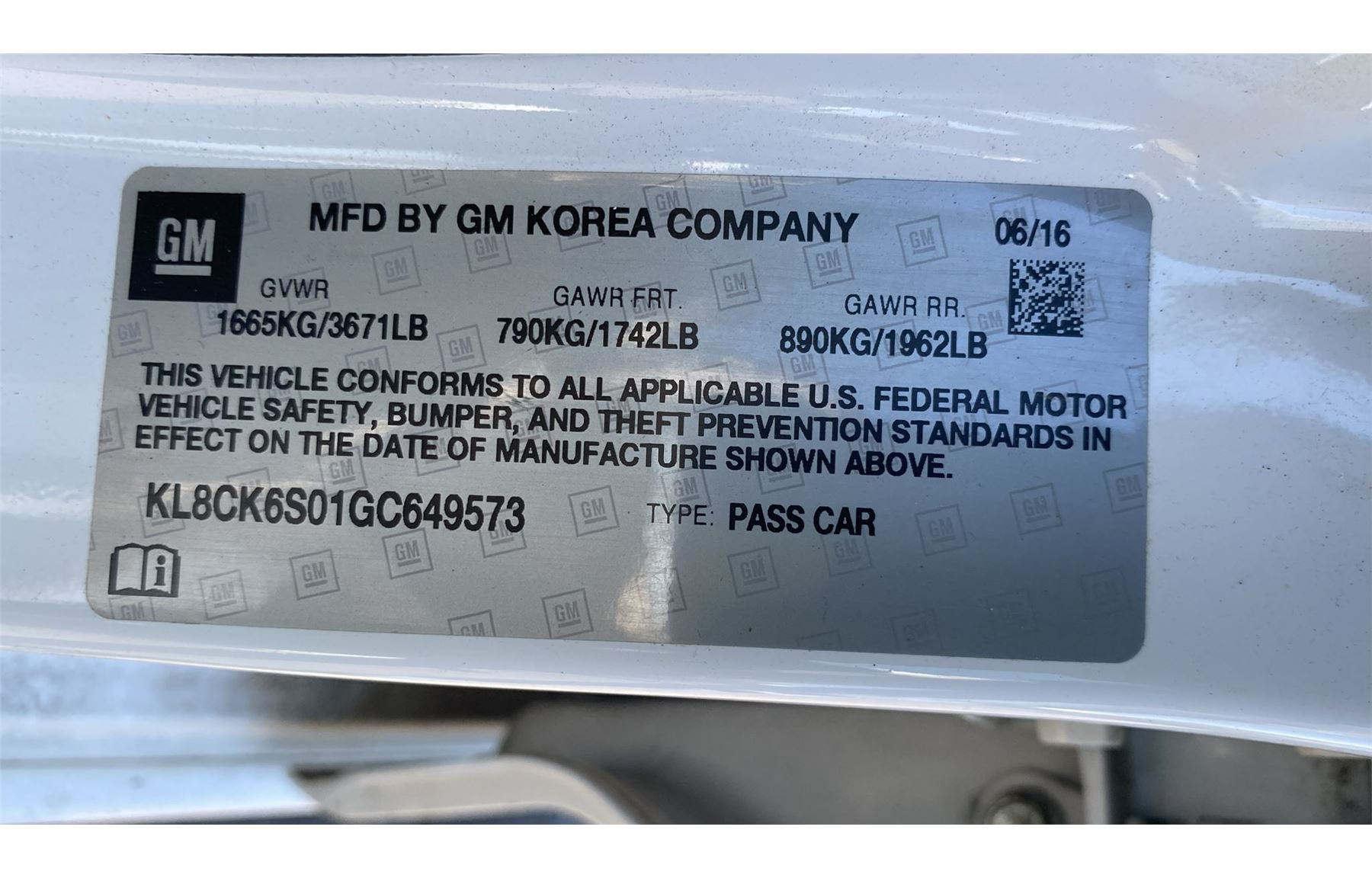 PAPER WORK : TPNO VIN : KL8CK6S01GC649573