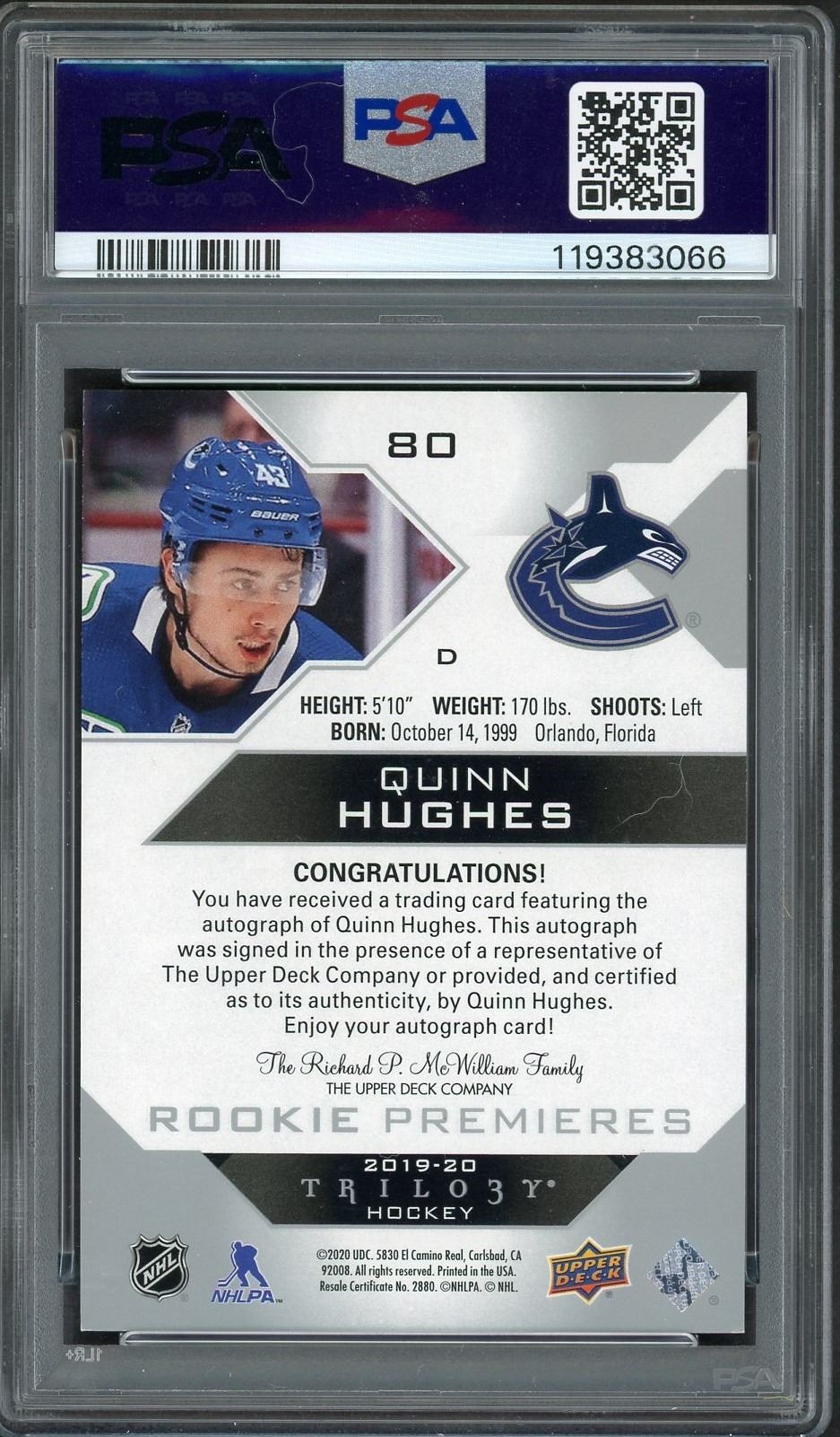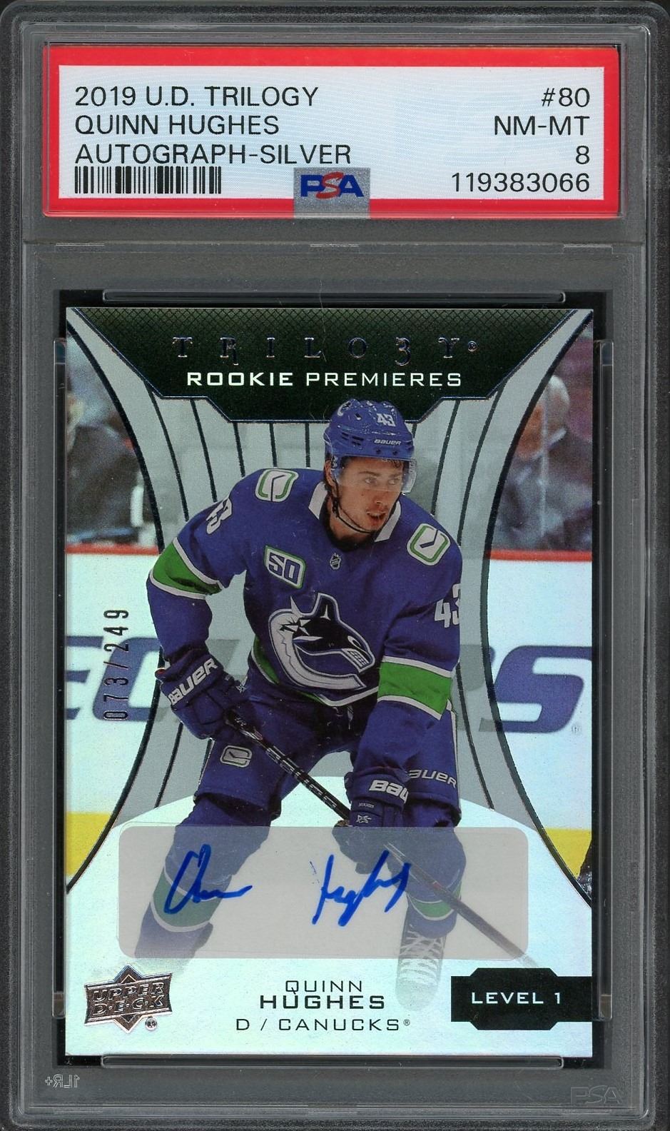 2019-20 UD Trilogy rookie premieres silver autograph #'d to 249 of Canucks star and Captain Quinn Hughes graded a near Mint 8 by PSA!