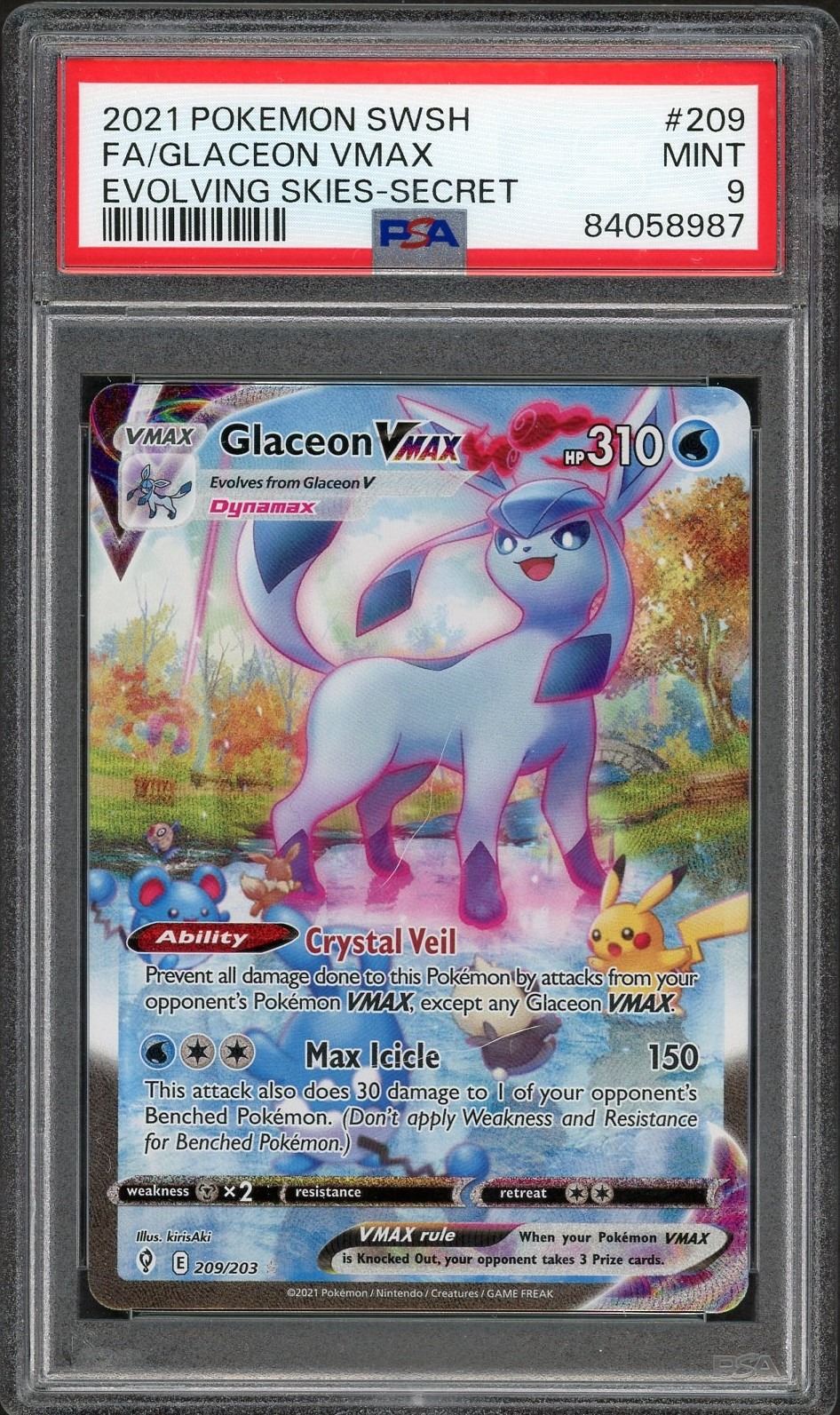 2021 Pokemon Full Art Alternate Art Glaceon VMAX from the very popular Evolving Skies set graded a mint 9 by PSA!