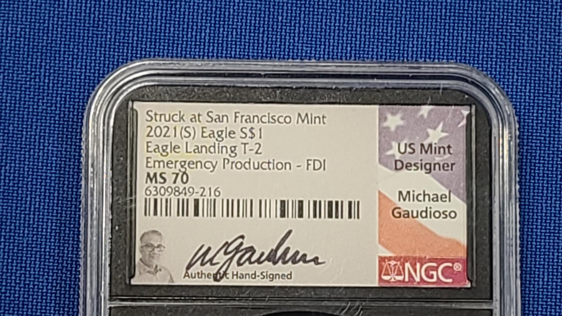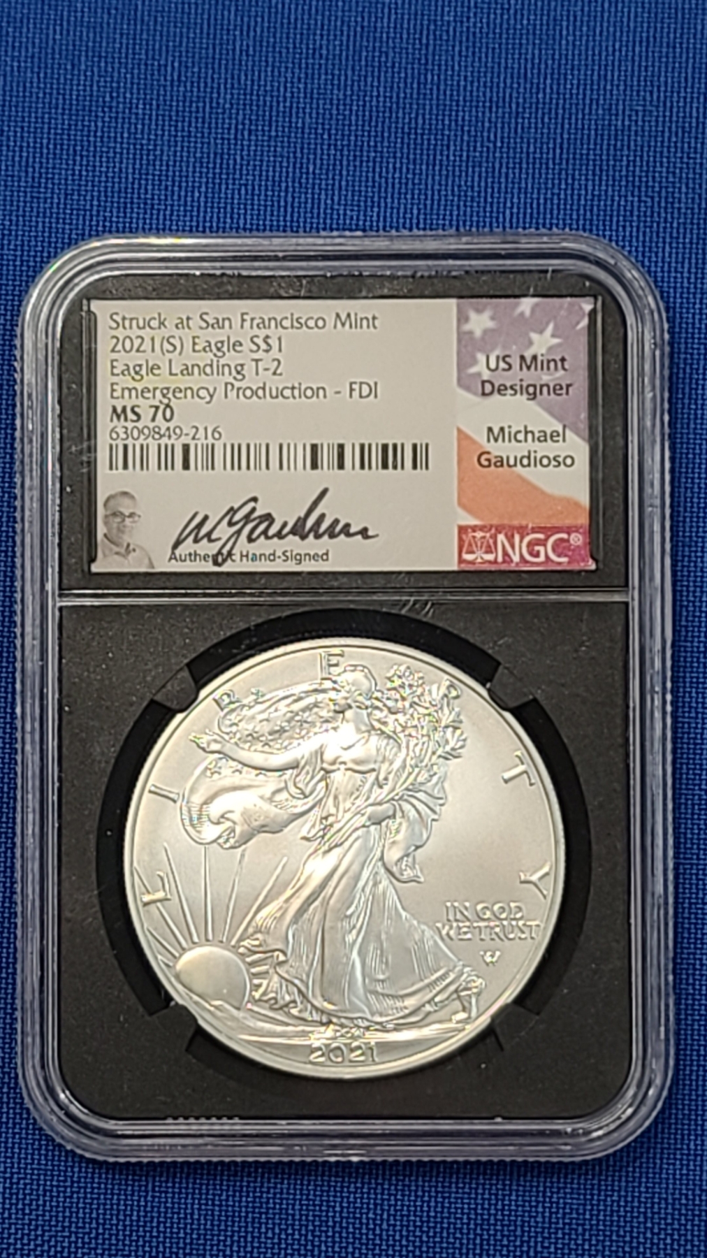 2021-S NGC Eagle Landing T-2 Emergency Production-FDI MS 70 Silver American Eagle Signed By U.S Mint Designer Michael Gaudioso