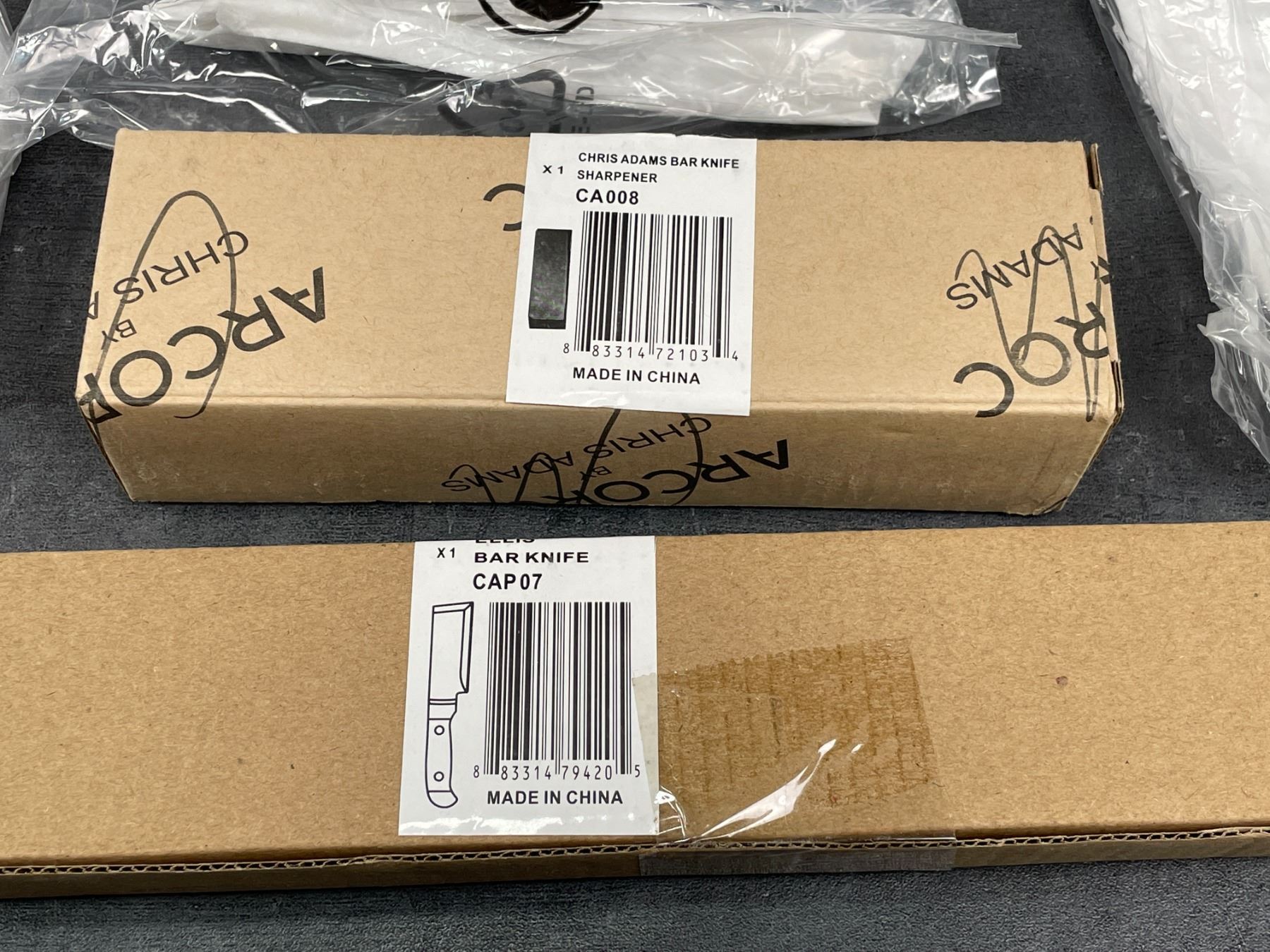 [New In Box,] (1) fine mesh strainer (1) tear drop bar spoon (1) ice tong (1) muddler (1) bar knife (1) knife sharpening stone (2) 28 oz. shaker tins (2) 20 oz. shaker tins (2) dual-sided paddle bar spoons (2) bell jiggers (2) Hawthorne strainers (2) Julep strainers (3) garnish / plating tweezers
