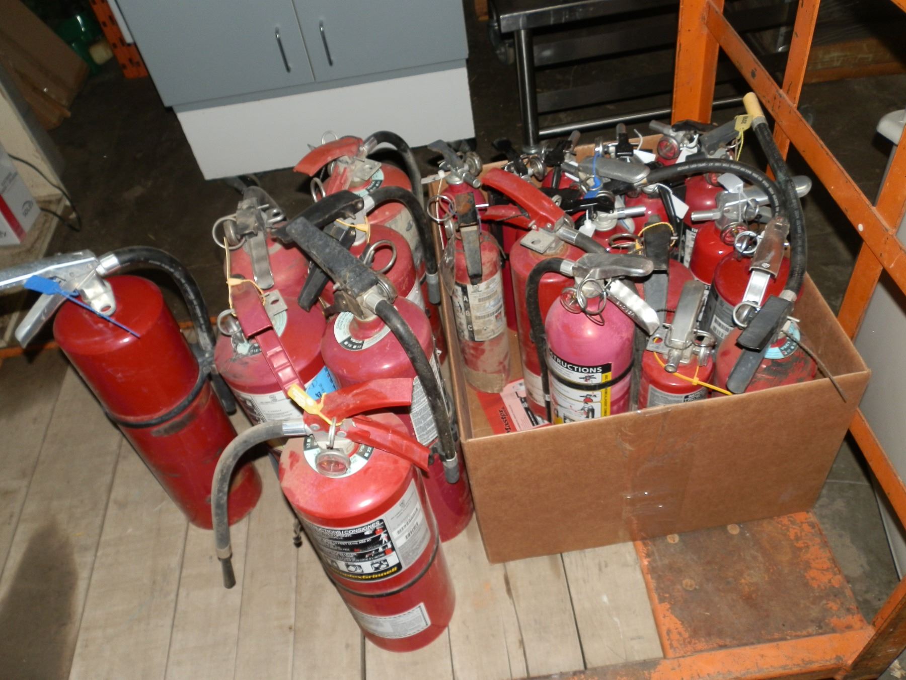 25 Fire Extinguishers, most are charged, various sizes.....New/Used