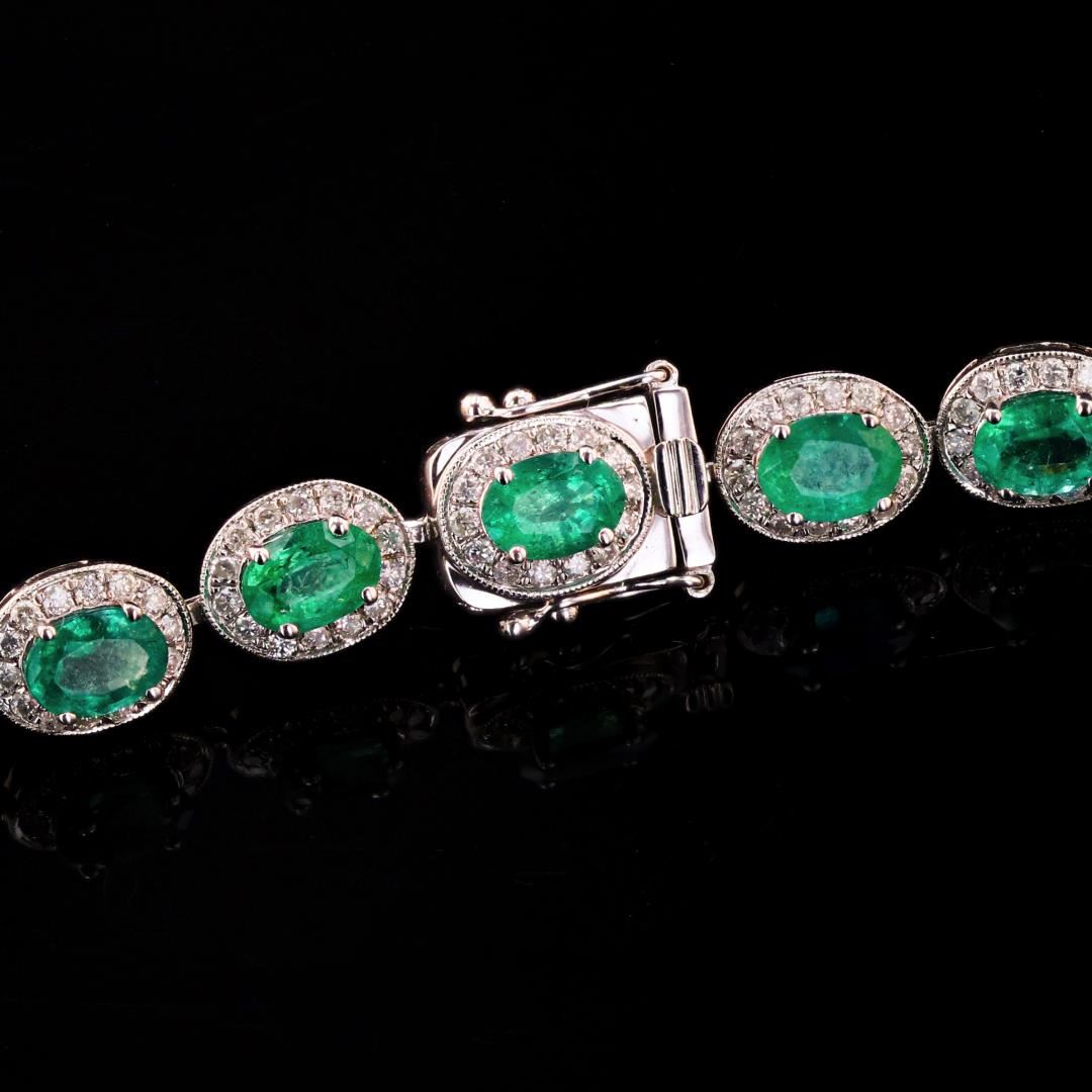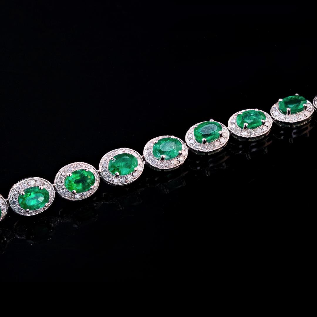 One polished, stamped, and tested 14K white gold necklace mounted witn: .36 genuine iacetea emeralds weighing approximately 29.41 carats, and 532 genuine round diamonds weighing approximately 6.69 carats. The necklace measures 17 inches in length and is finished with a tension lock clasp and double safety clasp. This item weighs 34.8 grams, condition is new, excellent workmanship. #MAIN GEMSTONES# Species: Natural Beryl Variety: Emerald Shape: Oval Cutting Style: Brilliant Cut Crown, Step Cut Pavilion Quantity: 38 Emeralds Measurements: 7 x 5mm Total Weight: 29.41 carats Color: Green Cut Grade: Very Good Refractive Index: 1.564 - 1.595 DR Birefringence: 0.005 to 0.009 Hardness: 7.5 - 8 #ADJACENT GEMSTONES ON NECKLACE# Identity: Natural Diamond Shape: Round Cutting Style: Brilliant Cut Quantity: 532 Diamonds Measurements: 1.3 - 1.5mm Total Weight: 6.69 carats Clarity Grade: I1 - I3 Color Grade: H - J Refractive Index: 2.418 Hardness: 10 TOTAL EMERALD WEIGHT: 29.41 cts TOTAL DIAMOND WEIGHT: 6.69 cts WEIGHT OF ITEM: 34.8 grams GOLD CONTENT: 14K White Gold #LREF-17299