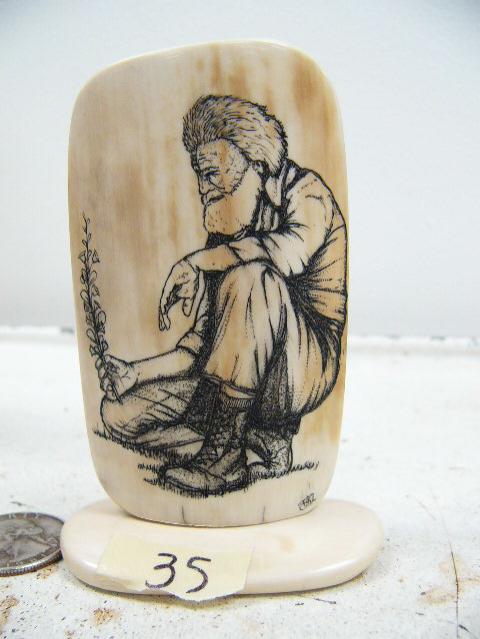 3-3/4" mammoth ivory scrimshawed man with fireweed in his hand (114)