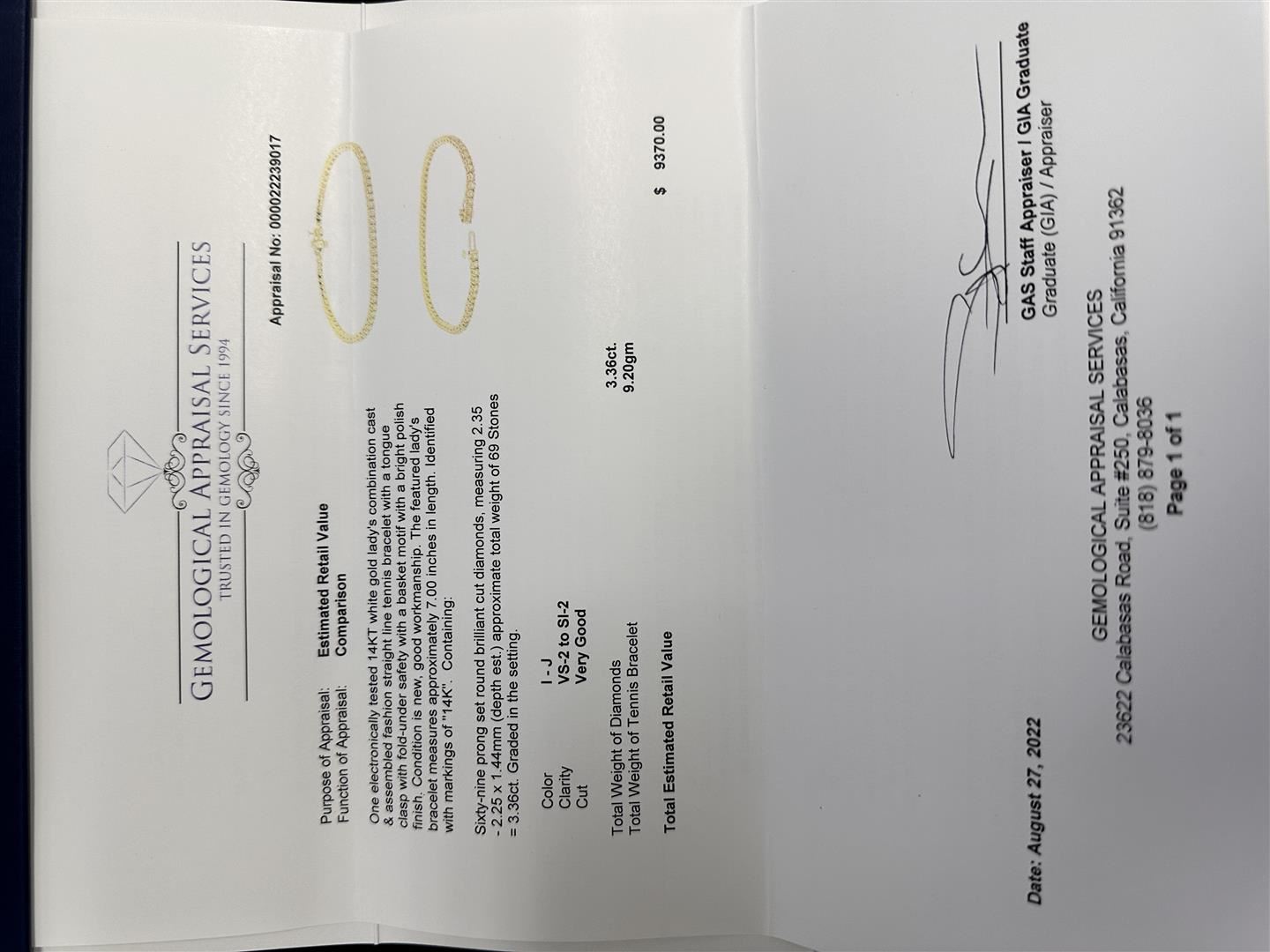 One electronically tested 14KT white gold lady's combination cast & assembled fashion straight line tennis bracelet with a tongue clasp with fold-under safety with a basket motif with a bright polish finish. Condition is new, good workmanship. The featured lady's bracelet measures approximately 7.00 inches in length. Identified with markings of 14K. Containing: 69 prong set round brilliant cut diamonds, approximate total weight of 69 stones = 3.36 ctw. Graded in the setting. Total weight of Diamonds: 3.36 ctw. Total estimated retail value: $9370
