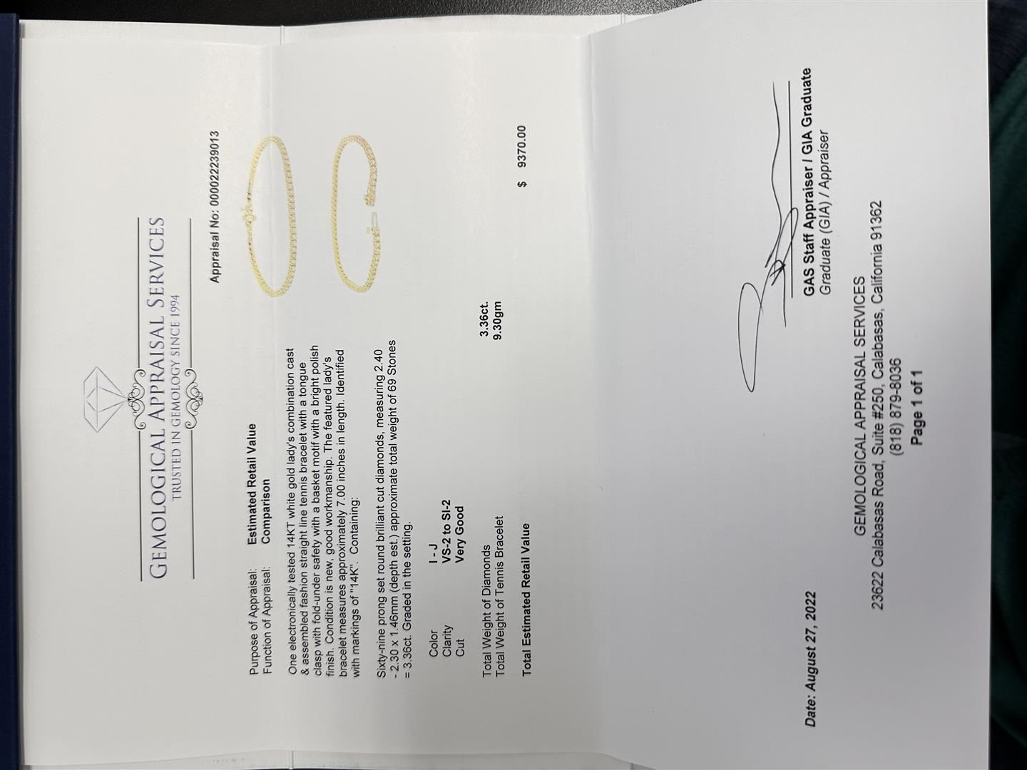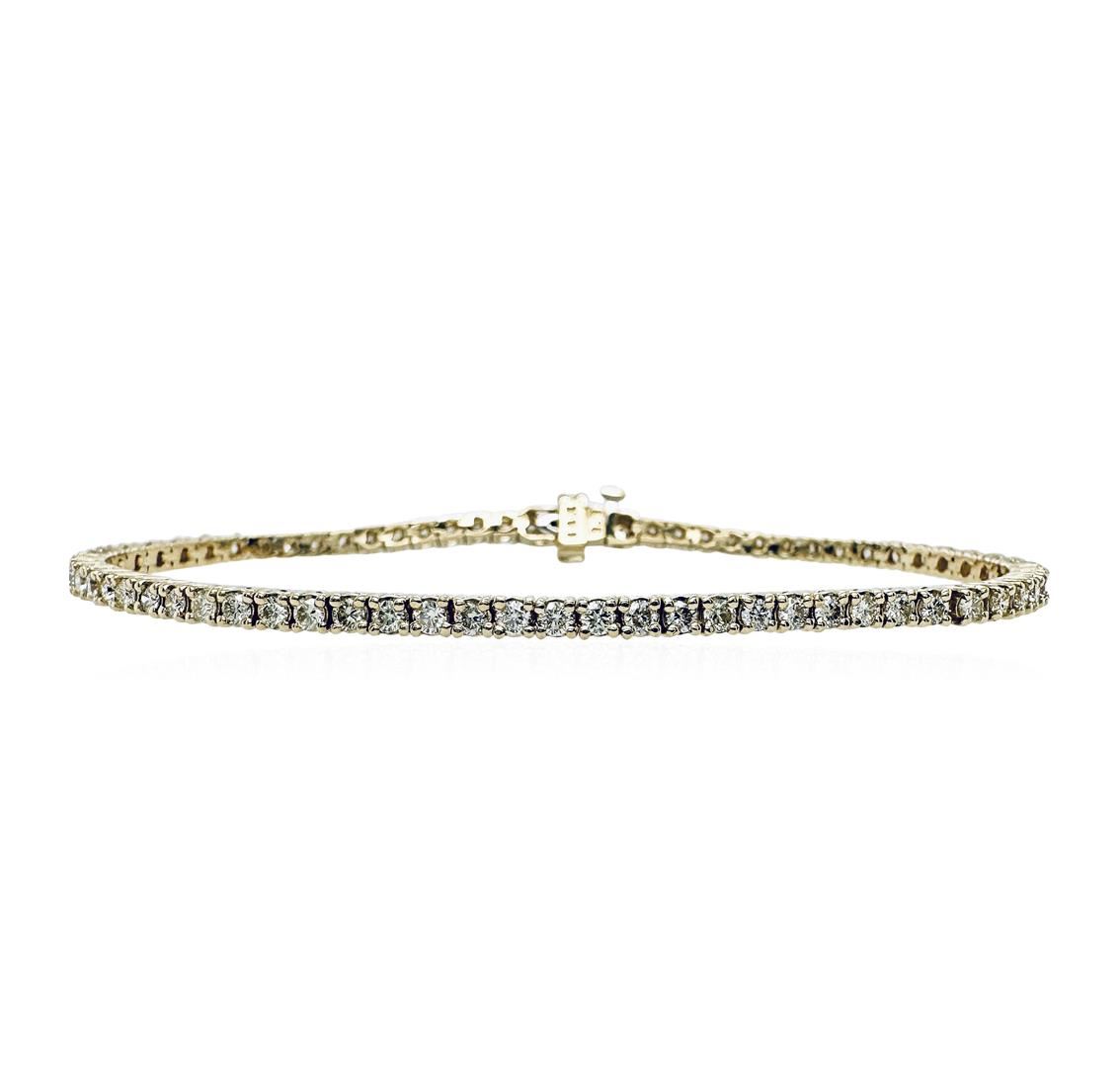 One electronically tested 14KT white gold lady's combination cast & assembled fashion straight line tennis bracelet with a tongue clasp with fold-under safety with a basket motif with a bright polish finish. Condition is new, good workmanship. The featured lady's bracelet measures approximately 7.00 inches in length. Identified with markings of 14K. Containing: 69 prong set round brilliant cut diamonds, approximate total weight of 69 stones = 3.36 ctw. Graded in the setting. Total weight of Diamonds: 3.36 ctw. Total estimated retail value: $9370