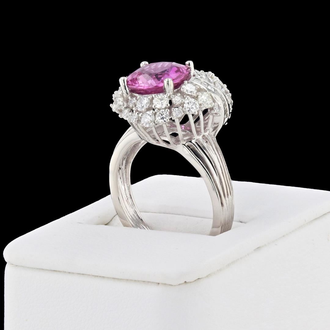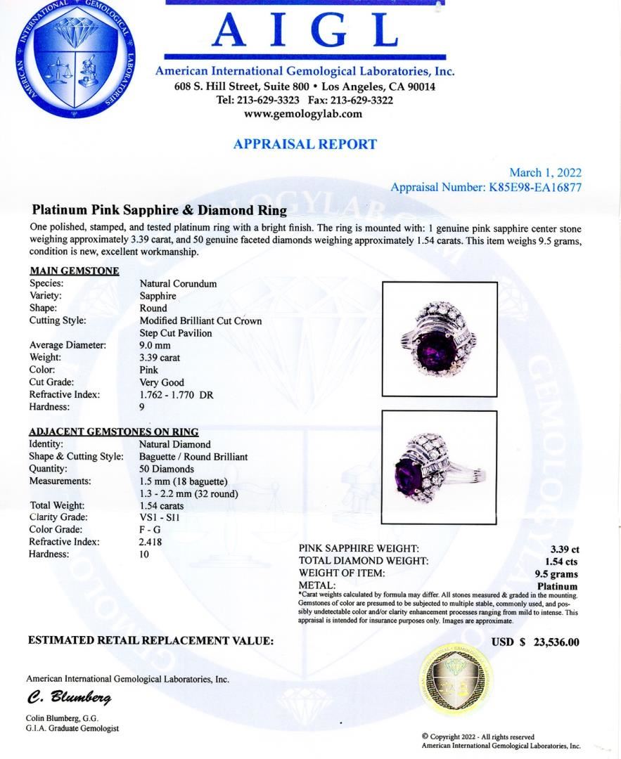 One polished, stamped, and tested platinum ring with a bright finish. The ring is mounted with: 1 genuine pink sapphire center stone weighing approximately 3.39 carat, and 50 genuine faceted diamonds weighing approximately 1.54 carats. This item weighs 9.5 grams, condition is new, excellent workmanship. #MAIN GEMSTONE# Species: Natural Corundum; Variety: Sapphire; Shape: Round; Cutting Style: Modified Brilliant Cut Crown, Step Cut Pavilion; Average Diameter: 9.0mm; Weight: 3.39 carat; Color: Pink; Cut Grade: Very Good; Refractive Index: 1.762 - 1.770 DR; Hardness: 9 #ADJACENT GEMSTONES ON RING# Identity: Natural Diamond; Shape and Cutting Style: Baguette / Round Brilliant; Quantity: 50 Diamonds; Measurements: 1.5mm (18 baguette), 1.3 - 2.2mm (32 round); Total Weight: 1.54 carats; Clarity Grade: VS1 - SI1; Color Grade: F - G; Refractive Index: 2.418; Hardness: 10; PINK SAPPHIRE WEIGHT: 3.39 ct; TOTAL DIAMOND WEIGHT: 1.54 cts; WEIGHT OF ITEM: 9.5 grams; METAL: Platinum #Size: 7.5