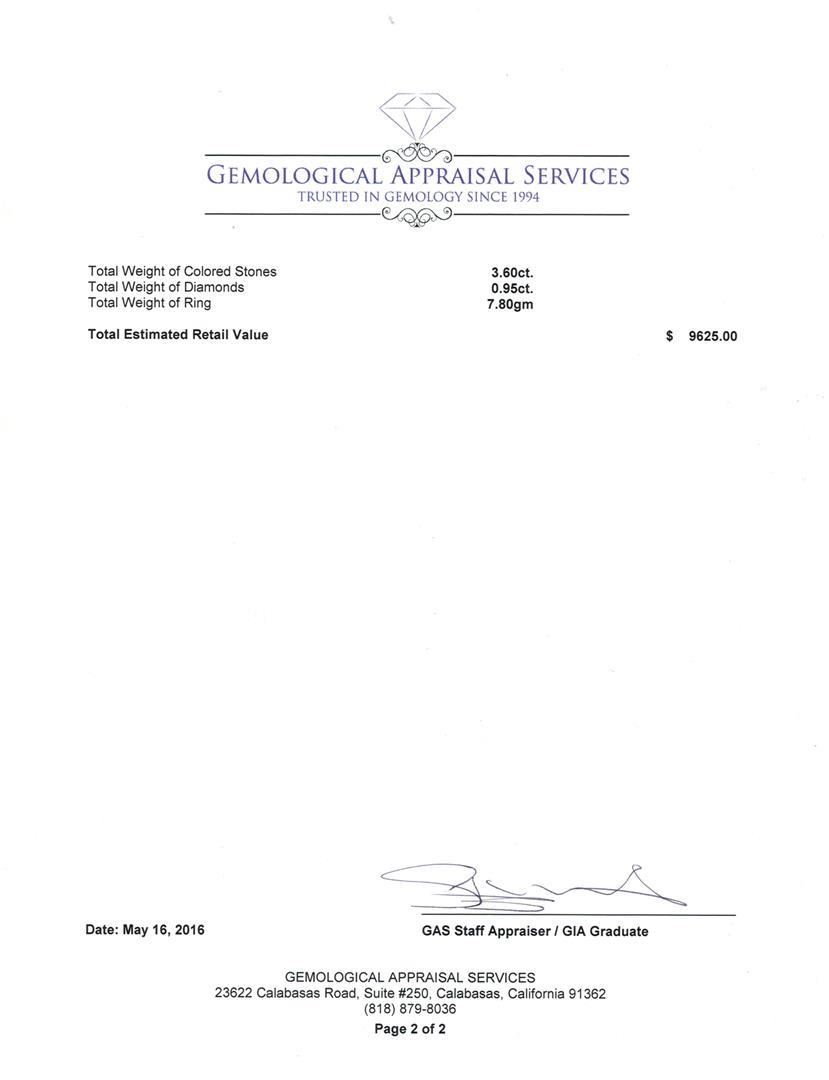 One electronically tested 14KT white gold lady's cast spiral design ring with a bright polish finish. The featured lady's ring has a shank measuring 1.98 millimeters wide. Identified with markings of "K14". Condition is new, good workmanship. Containing: One prong set oval modified brilliant cut natural tanzanite, measuring 10.35 x 8.40 x 5.83mm, approximate weight of 3.60 ct., clarity is eye clean, medium dark, very slightly grayish, violetish blue color, (GIA vB 6/3), cut is very good. Transmitting light with no distortion, transparent. Colored gemstones are presumed to have been subjected to commonly used enhancement processes. Graded in the setting. Fourteen prong set round brilliant cut diamonds, measuring 1.90 - 1.80 x 1.13mm (depth est.) approximate total weight of 14 Stones = 0.33ct. Graded in the setting. Clarity: SI-1 to SI-2. Color: H - I. Cut Good Fourteen prong set round brilliant cut diamonds, measuring 1.70 - 1.60 x 0.99mm (depth est.) approximate total weight of 14 Stones = 0.22ct. Graded in the setting. Clarity: SI-1 to SI-2. Color: H - I. Cut Good Forty prong set round brilliant cut diamonds, measuring 1.40 - 1.35 x 0.86mm (depth est.) approximate total weight of 40 Stones = 0.40 ct. Graded in the setting. Clarity: SI-1 to SI-2. Color: H - I. Cut Good. Total Weight of Colored Stones 3.60 ct. Total Weight of Diamonds 0.95ct. Total Weight of Ring 7.80gm. GAS Appraised.