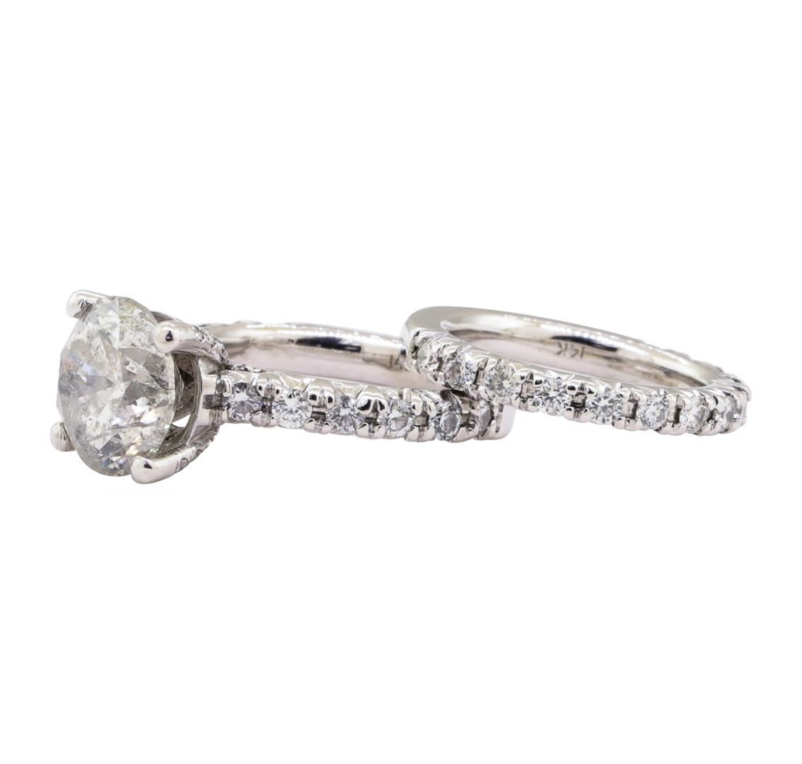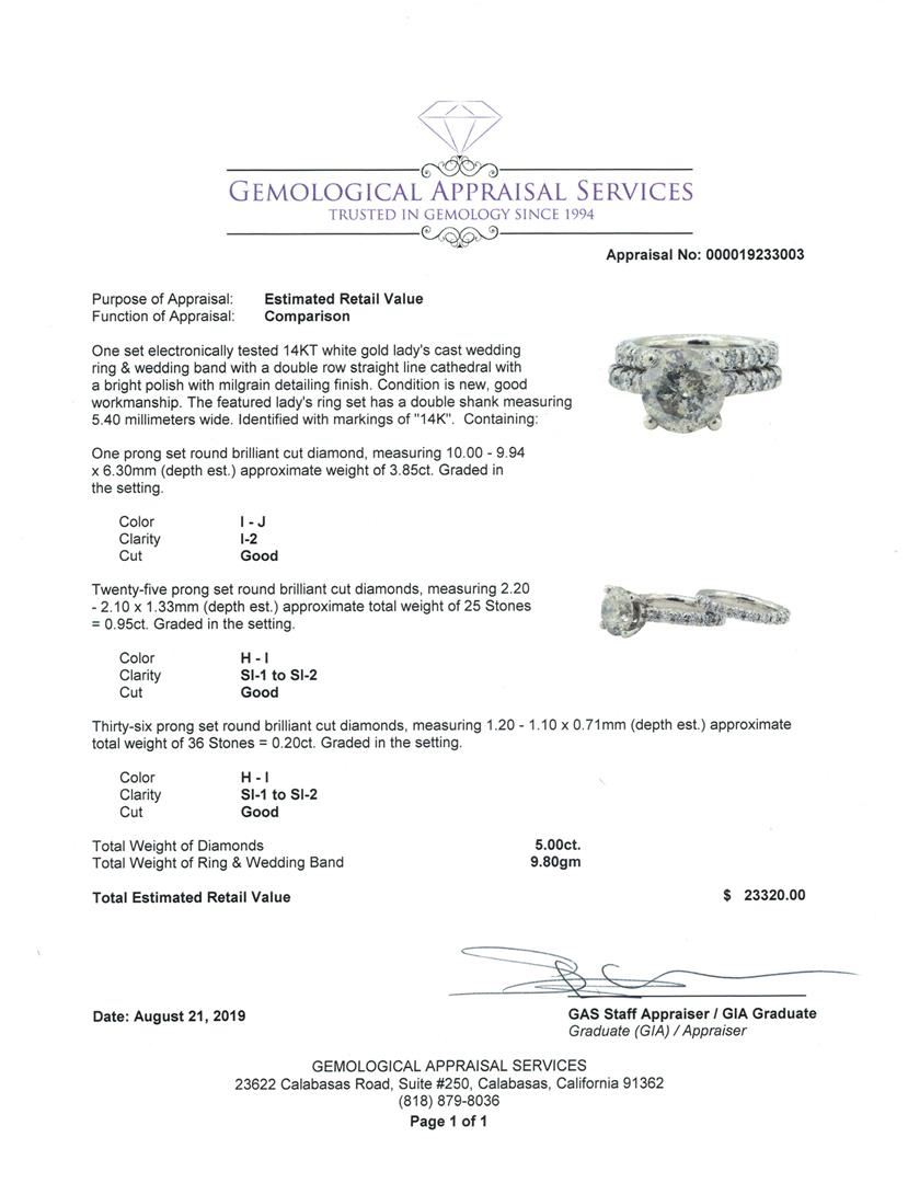 One set electronically tested 14KT white gold lady's cast wedding ring & wedding band with a doubole row straight line cathedral with a bright polish with milgrain detailing fininsh. Condition is new, good workmanship. The featured lady's ring set has a double shank measuring 5.40 millimeters wide. identified with markings of "14K". Containing: One prong set roundbrilliant cut diamond, measuring 10.00 - 9.94 x 6.30mm (depth est.) approximate weight of 3.85ct. Graded in the setting. Color I-J. Clarity I-2. Cut Good. Twenty-five prong set round brilliant cut diamonds. Measuring 2.20 - 2.10 x 1.33 (depth est.) approximate total weight of 25 stones = 0.95ct. Graded in the setting. Color H-I. Clarity SI-1 to SI-2. Cut good. Thirty-six prong set round brilliant cut diamonds, measuring 1.20-1.10x0.71 (depth est.) approximate total weight of 36 stones=0.20 ct. Graded in the setting Color H-I. Clarity SI-1 to SI-2. Cut Good. Total weight of diamonds 5.00 ct. Total weight of ring and wedding band 9.80gm. Total estimated retail value $23320.00