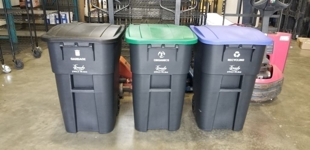 3 BRAND NEW STACKING WITH LID GARBAGE BINS - GARBAGE, COMPOST AND RECYCLING, 22" X 24"X 35" 80 GALLON