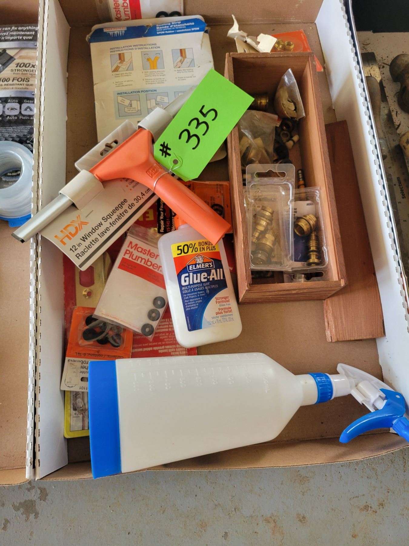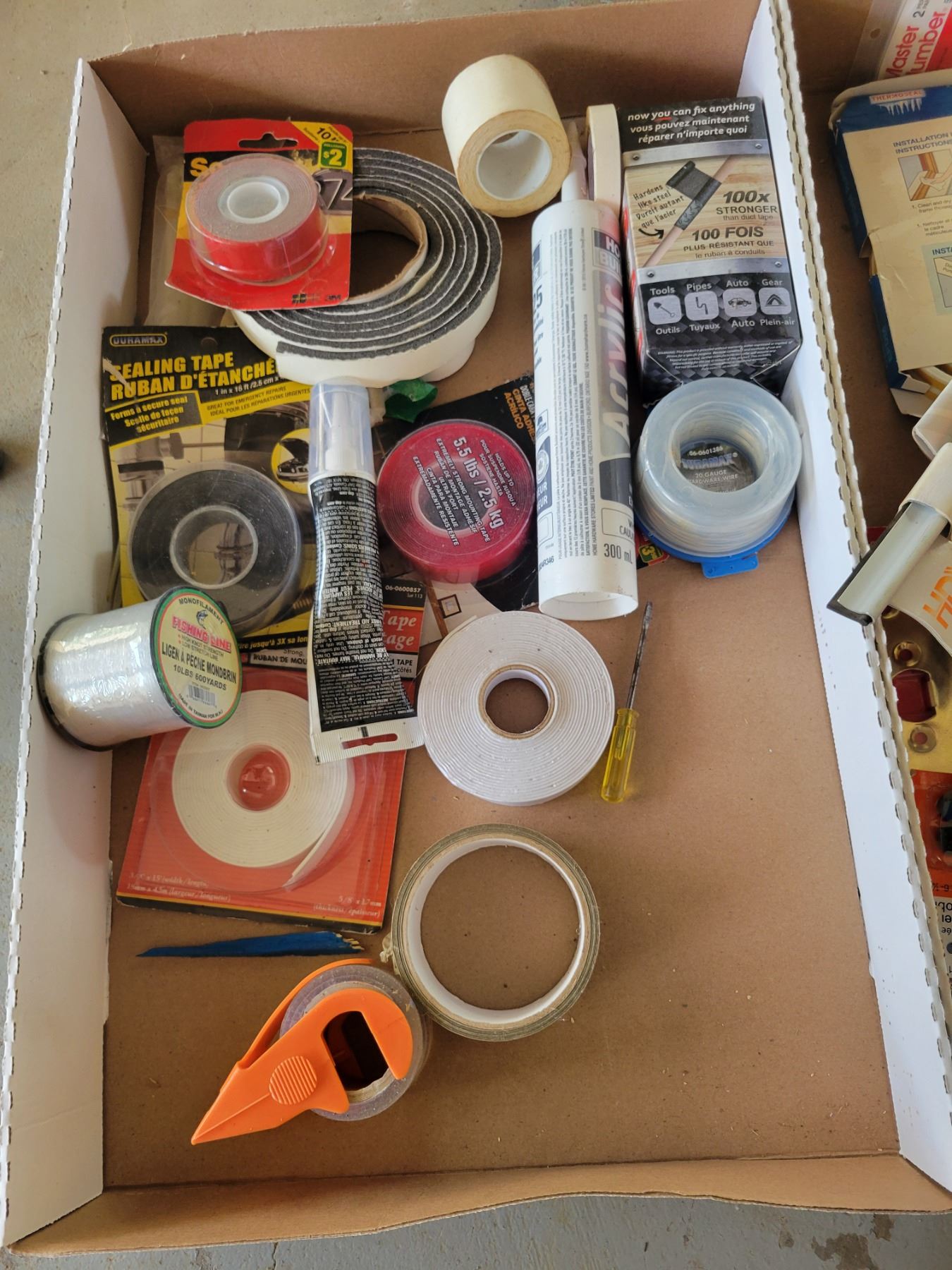 3 Boxes of Misc Spray Jug, Hammer, File, Glue, Tapes, Sealing Tape, Silicone