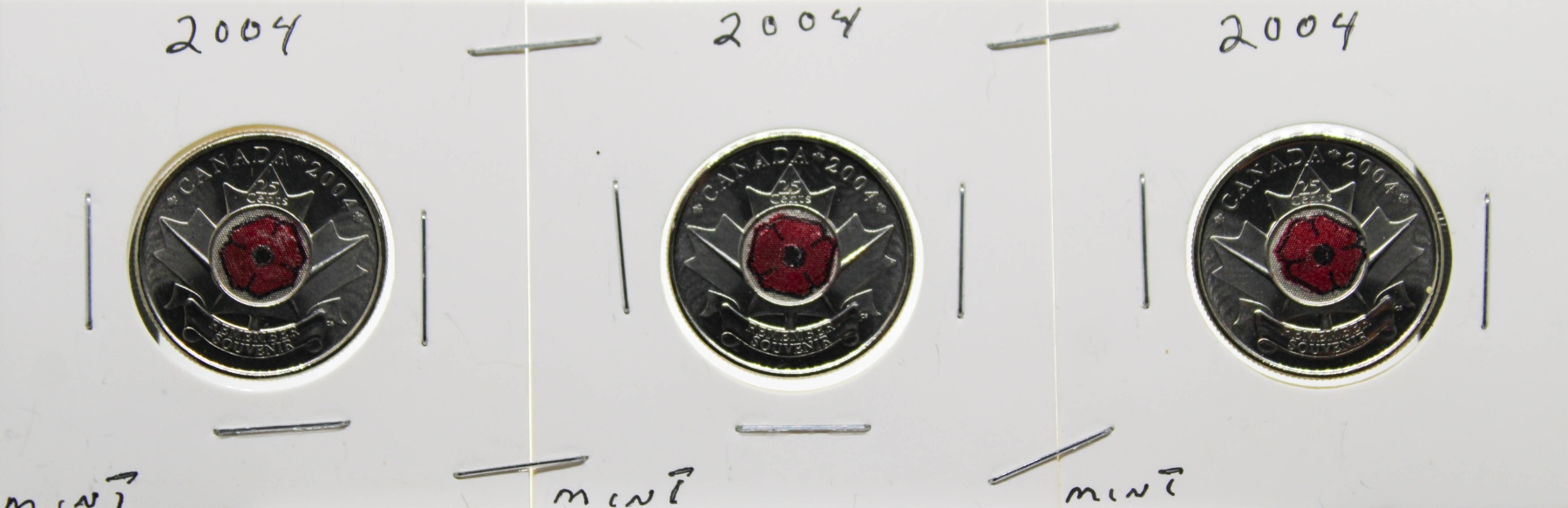 3 CANADIAN 2004 REMEMBERANCE POPPY 25 CENTS