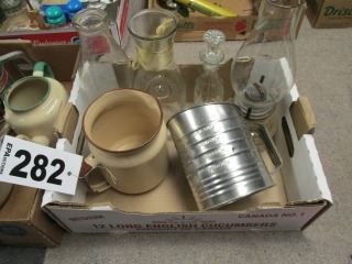 3 COLLECTOR'S FLOUR SIFTERS, ENAMEL TEAPOT, ENAMEL PITCHER, KEROSENE LAMP, MILK BOTTLE, GLASS DECANTER & GLASS VINEGAR DECANTER