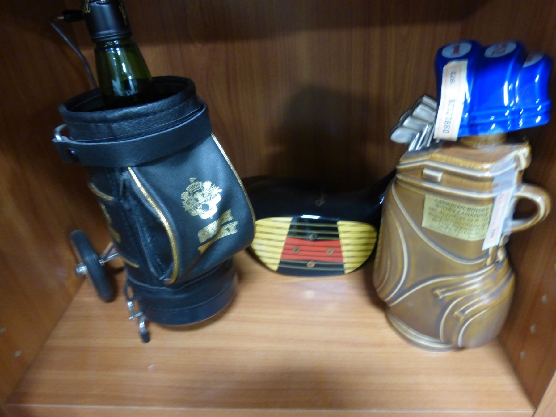 3 DECANTERS - SCOTCH GOLF BAG, CANADIAN WHISKEY GOLF BAG & MCGIBBONS SCOTCH CLUB GOLF CLUB