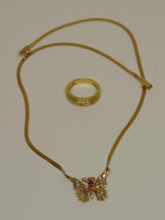 Times the money (#1) Retail Value $3,790 18Kt Yellow Gold -- 3 Diamonds Ladies Hand Made Wedding Band -- (#2) Retail Value $2,430 14Kt Yellow Gold -- AAA Burmese Ruby & Diamonds Butterfly Necklace --