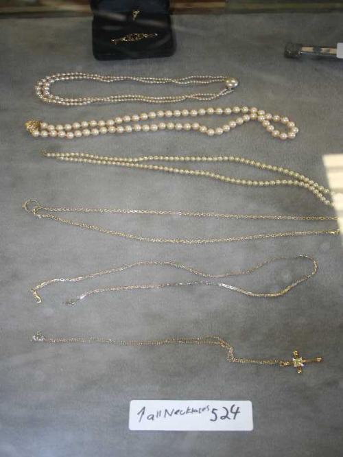 3 GOLD NECKLACES AND 2 PEARL NECKLACES