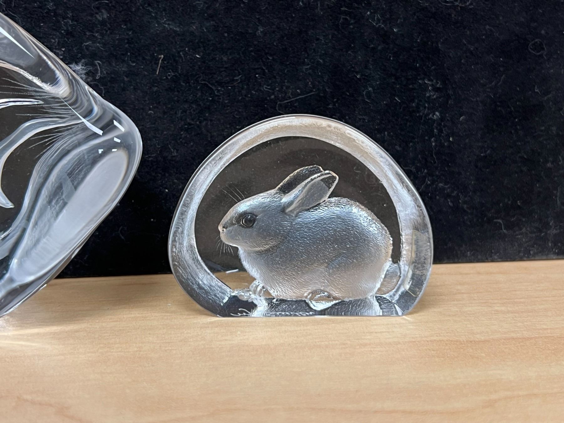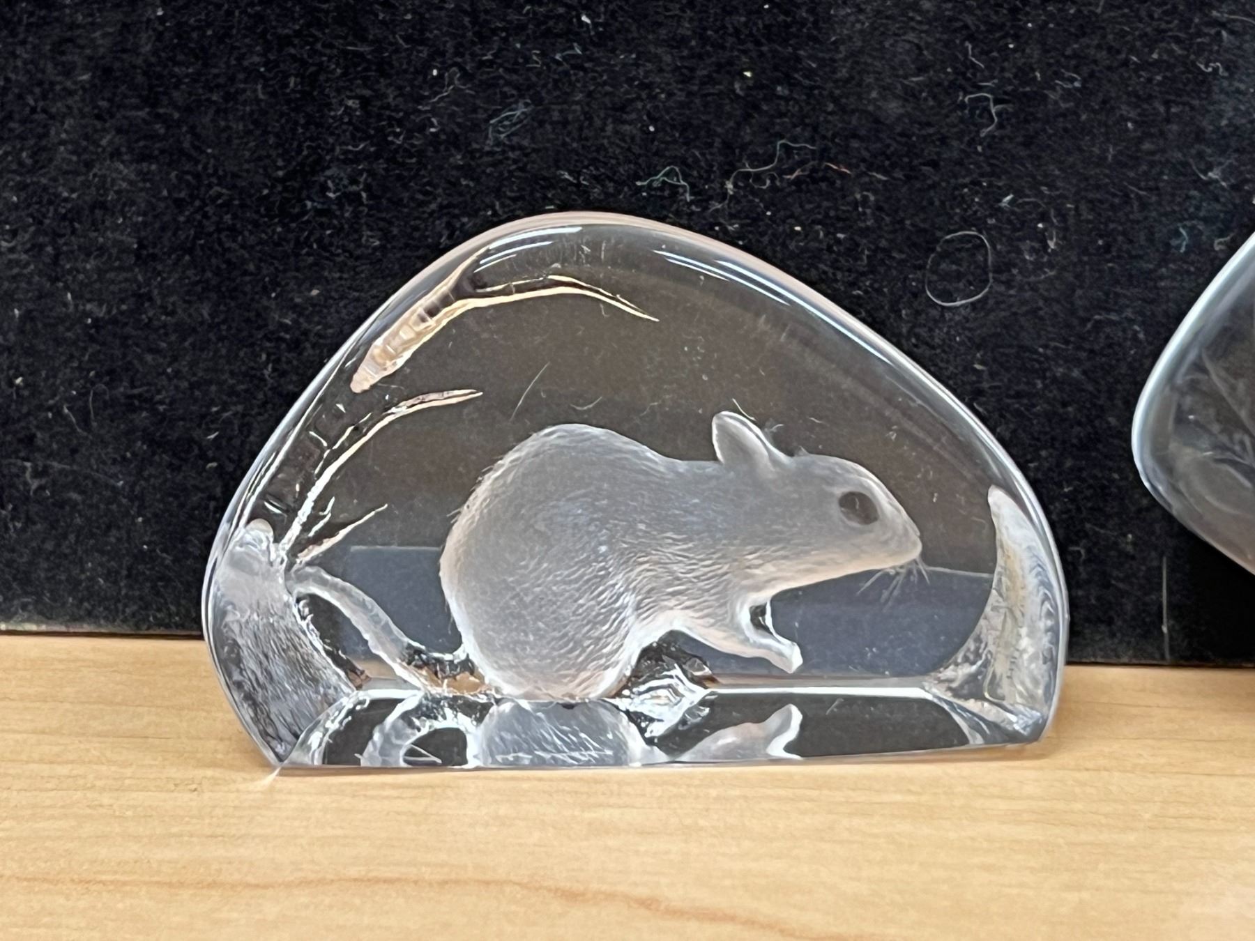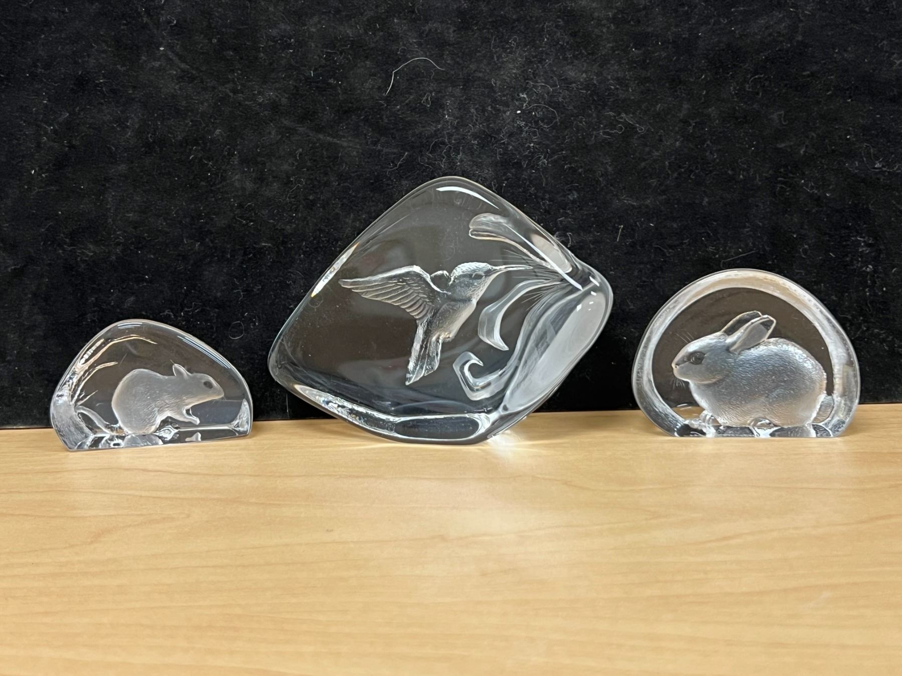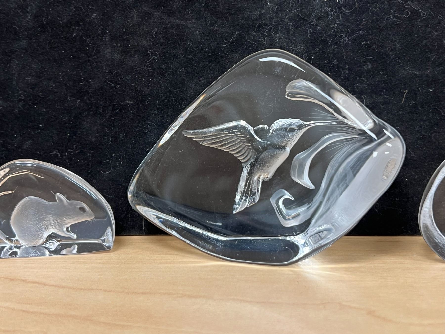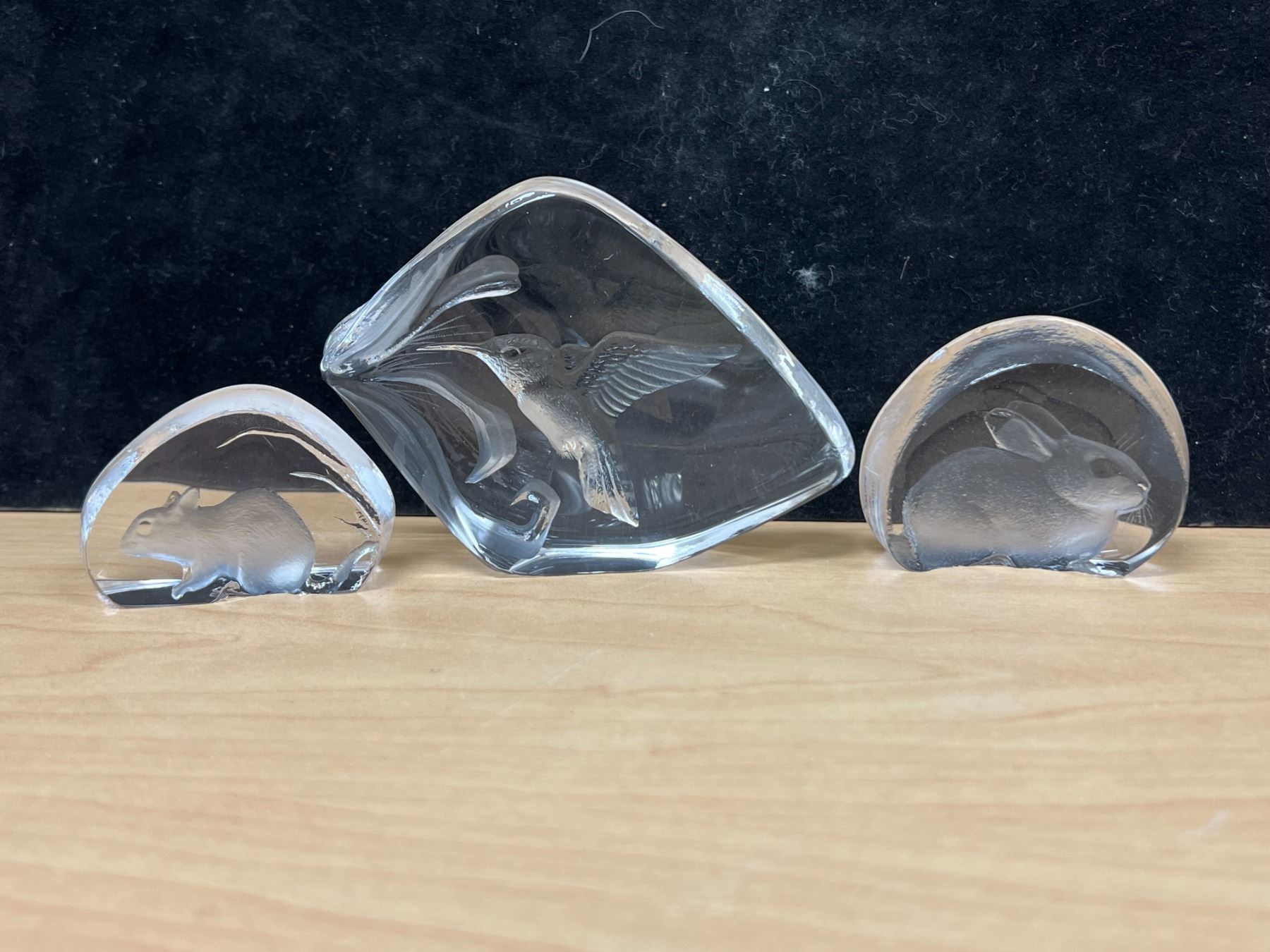3 Mats Jonasson (Sweden) Art Glass Animal Paperweights - largest approx: 4"W 3"T
