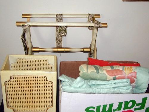 3 pcs French Provincial Luggage Stand, Straps are Broken; French Provincial Waste Basket with Wicker Sides; Box Linens