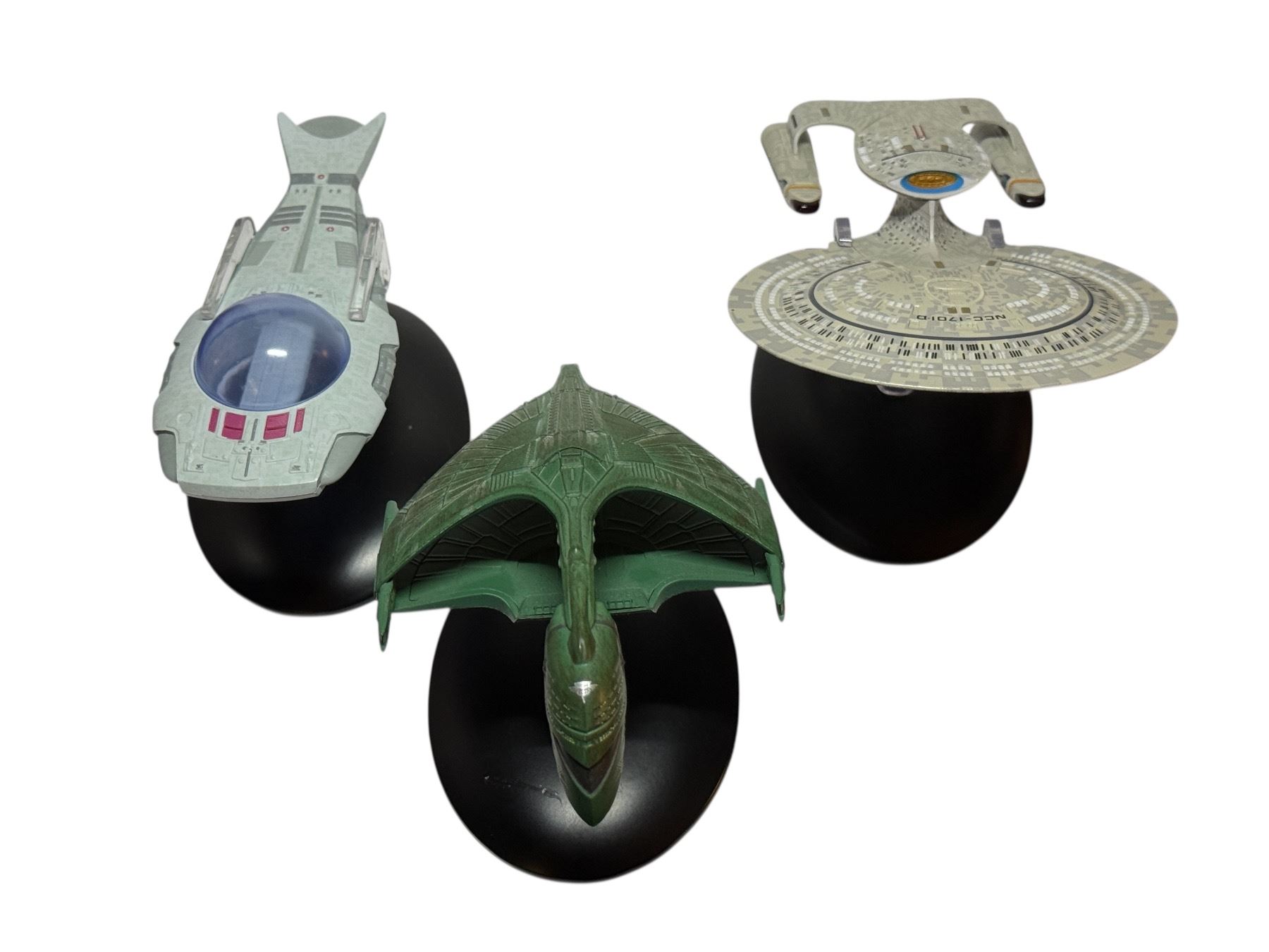 3 Piece Star Trek Starship Models - ROMULAN WARBIRD 0353-A/A TM & © 2019 CBS Studios Inc. , TARELLIAN SHIP 2582-A/A TM & © 2020 CBS Studios Inc. , U.S.S. ENTERPRISE NCC-1701-D 3912-A/P TM & © 2012 CBS Studios Inc. , with base & stand. DOESN'T INCLUDE BOX(ES)
