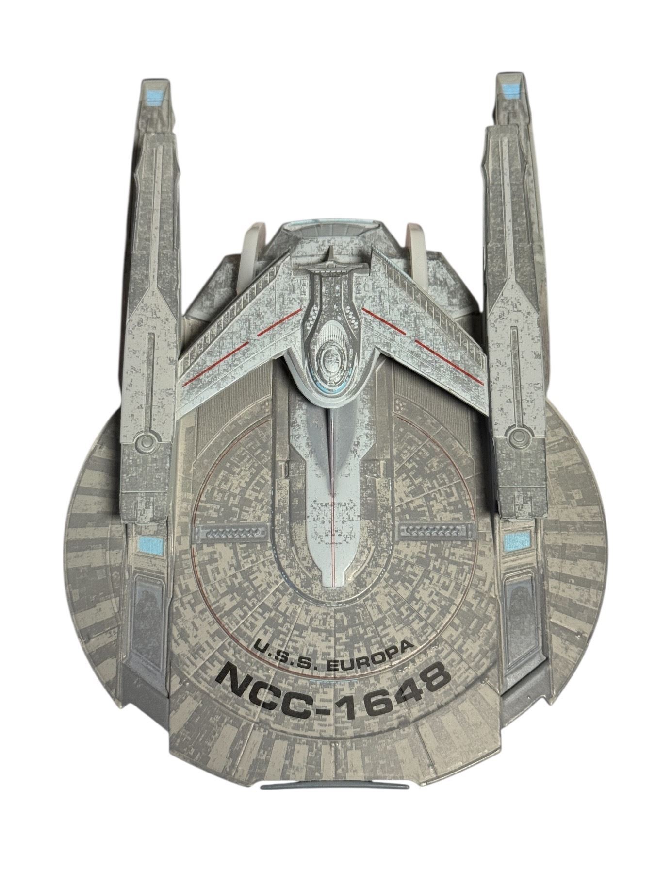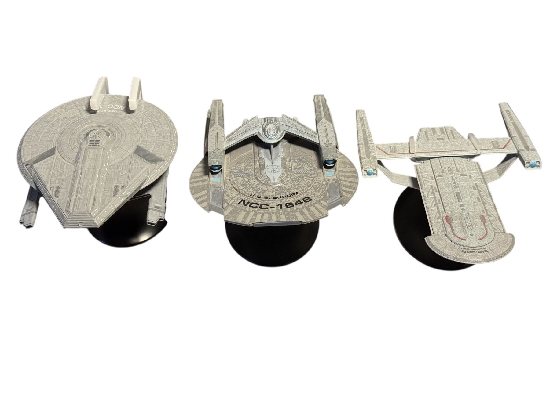 3 Piece Star Trek Starship Models - U.S.S. HIAWATHA NCC-815 2884-A/A TM & © 2019 CBS Studios Inc. , U.S.S. EDISON 1990-A/A TM & © 2019 CBS Studios Inc. U.S.S. EUROPA 8808-A/A TM & © 2018 CBS Studios Inc , with base & stand. DOESN'T INCLUDE BOX(ES)