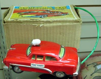 3 Tin Toy Vehicles; Remote Control Fire Chief Car With Box, Friction Rolls Royce And Jalopy