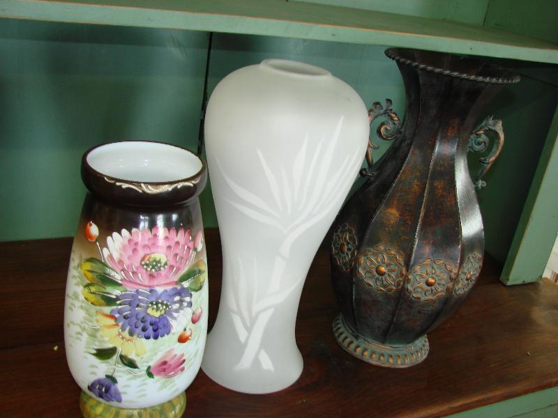 3 vases, glass & metal, apprx. 12" to 16" tall