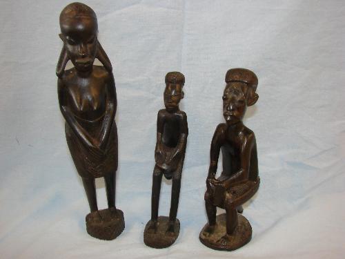 3 wood carved African statues,ranging from apprx. 7" - 9" tall