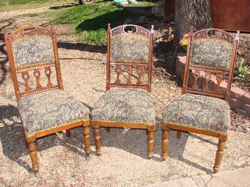 3 wood carved, tapestry padded chairs