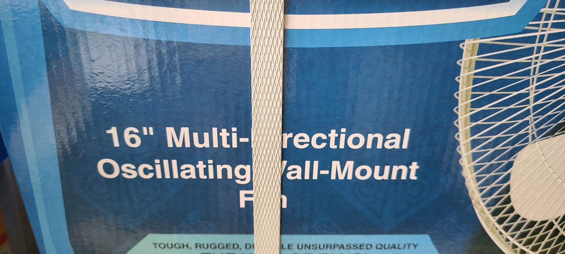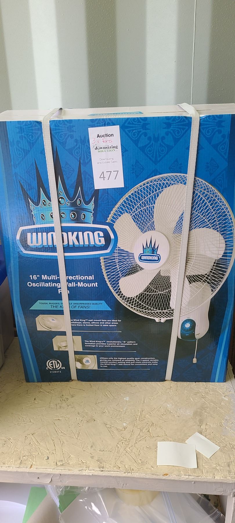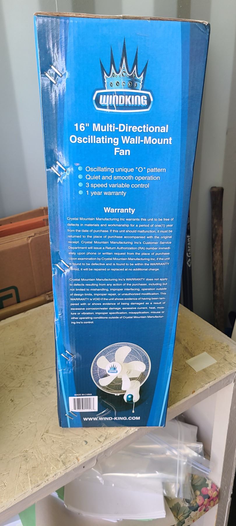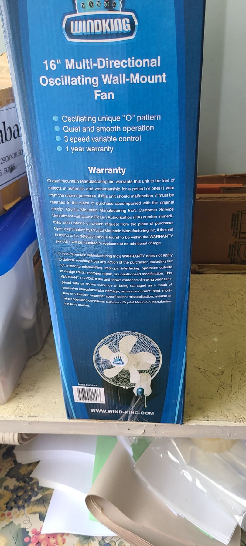 3 x New in Box, Wind King 16" oscillating wall mount fans. Pickup at 10 am