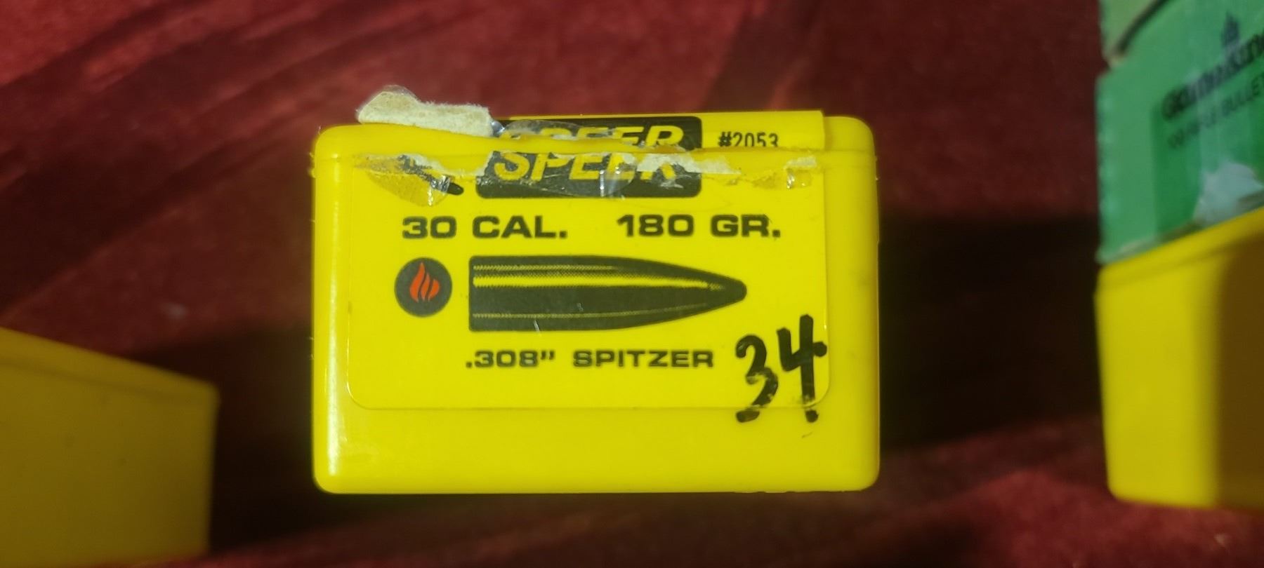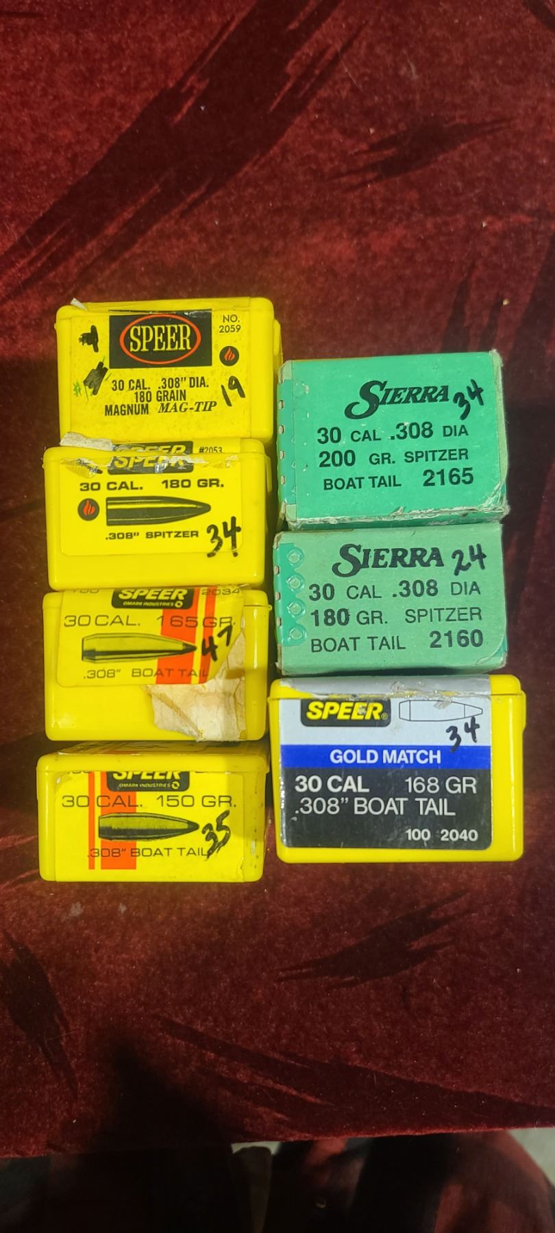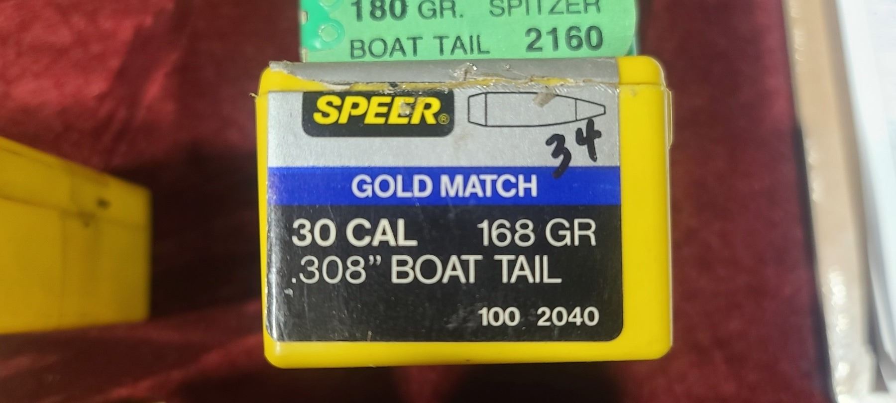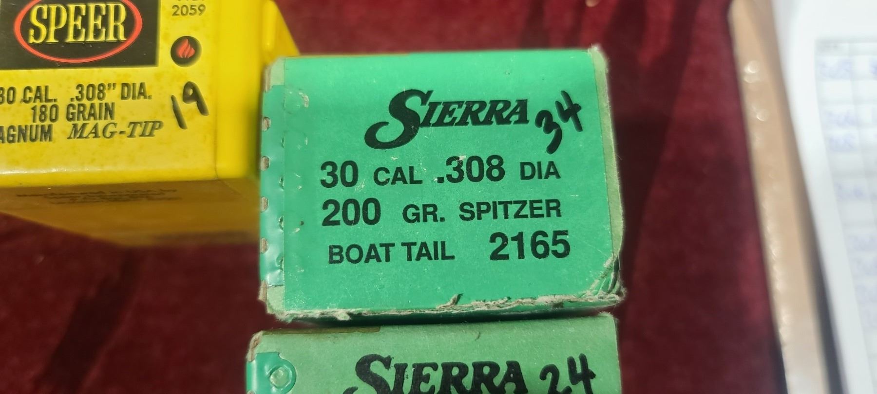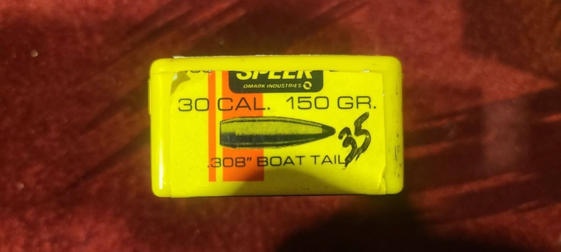 30CAL (.308) MIXED GRAIN BULLET LOT : QTY35 150GR BT - QTY47 165GR BT - QTY34 180GR SPITZER, QT19 180GR MAG TIP - QTY 34 168GR BOAT GOLD MATCH,