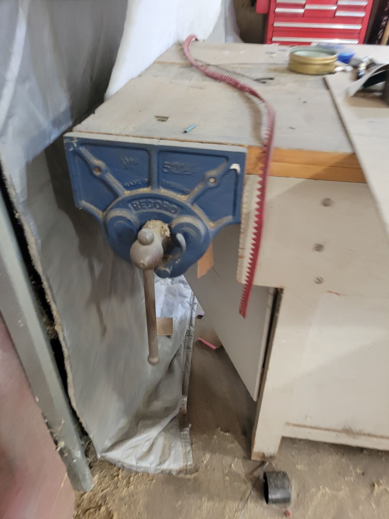 30in. x 96in. work bench with compartments c/w 2 wood work vises built in, extention on 1 side