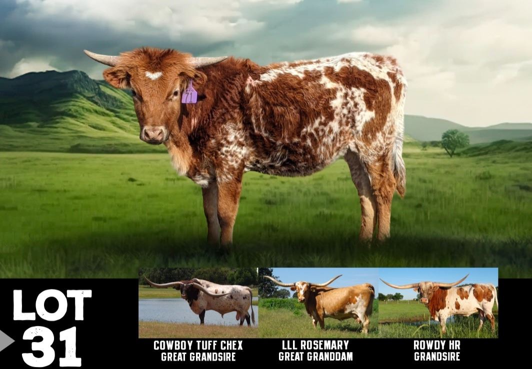COMMENTS: It’s time to continue your longhorn legacy with this great young heifer! SSR Buttons’ Legacy is sired by a beautiful blue roan bull SSR Iron Buttons and out of an over 70” 3 yr old cow, Rowdy’s Wild Legacy from Bob Larson’s program. SSR Buttons’ Legacy will be just a year-old at sale, but with a strong maternal line and outcrossed paternal line she will be an awesome addition to any herd. Wonderful conformation and disposition. Bid with confidence on this great heifer
