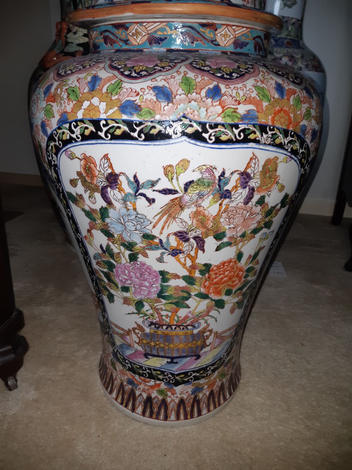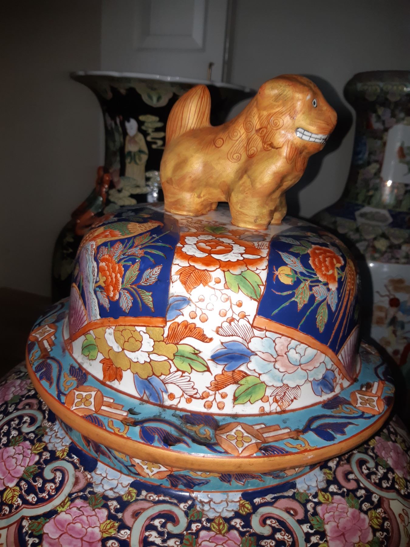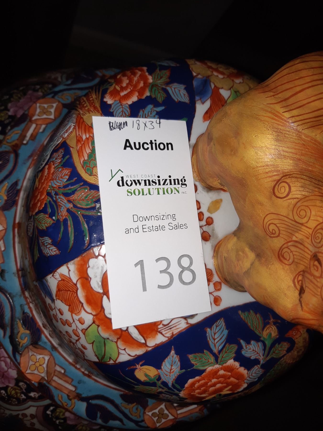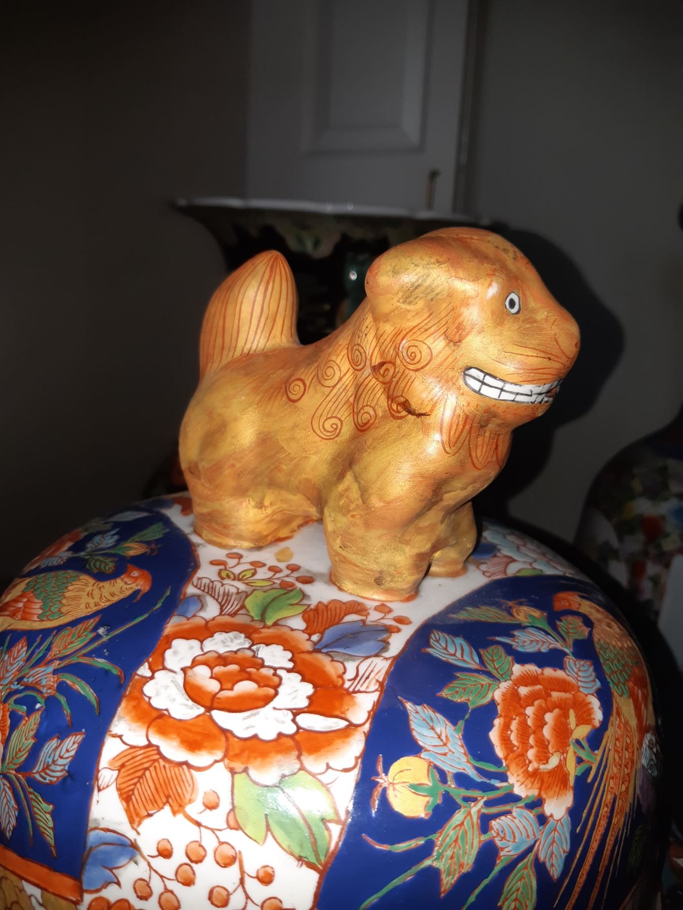 34" Chinese lidded Ginger Jar. Lid has Dog on top. Pickup at 10:30 am